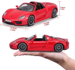 Всеки елемент на модела Bburago Porsche 918 Spyder е прецизно изработен, за да се доближи максимално до истинския автомобил. От вентилационните отвори до колелата с реалистични гуми.