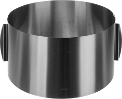 Професионален регулируем ринг за торти от неръждаема стомана с височина 15 см за перфектни високи блатове и многослойни десерти. Благодарение на здравите щипки е стабилен дори при максимално разтягане, регулира се плавно в диапазона 16–30 см без инструменти, безопасен е за контакт с храни и може да се мие в съдомиялна.