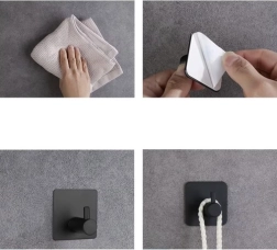 Монтажът е бърз и чист – без пробиване и без инструменти. За максимално сцепление е достатъчно да почистите повърхността (напр. с спирт), да затоплите лепящия слой със сешоар и да притиснете здраво. При необходимост куката може да се свали без да повреди основата и без да оставя следи.