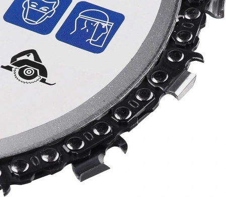 Веригата може лесно да се преточи със стандартна пила за вериги, което удължава живота на диска и поддържа постоянна режеща ефективност. Стандартният отвор 22,2 мм и диаметър 115 мм гарантират бърз монтаж към повечето ъглошлайфи.
