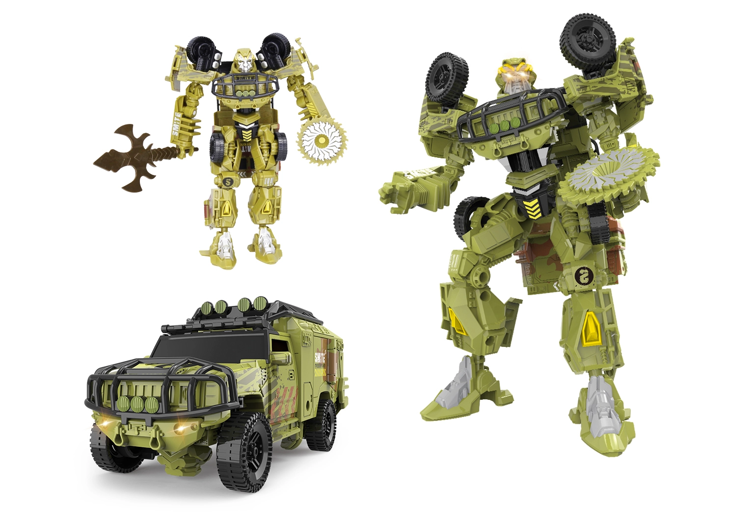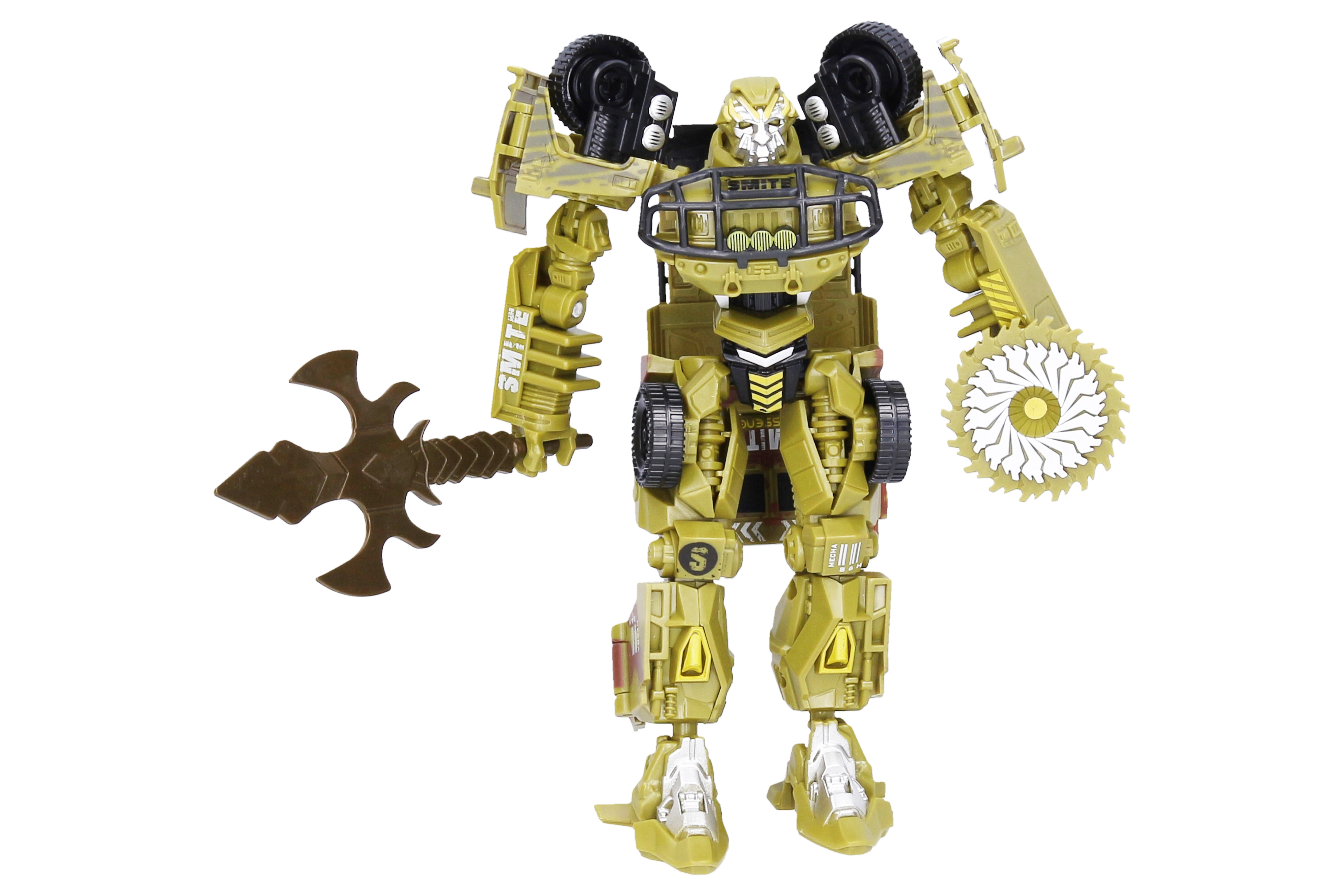 В комплекта са включени 2 сменяеми оръжия – меч за прецизни атаки и дисков трион за по-дръзки действия. Детайлната изработка и издръжливите пластмасови части са идеални за ежедневна игра. Предлагат се син или зелен вариант, които ще зарадват малки и големи фенове на трансформиращите се роботи.