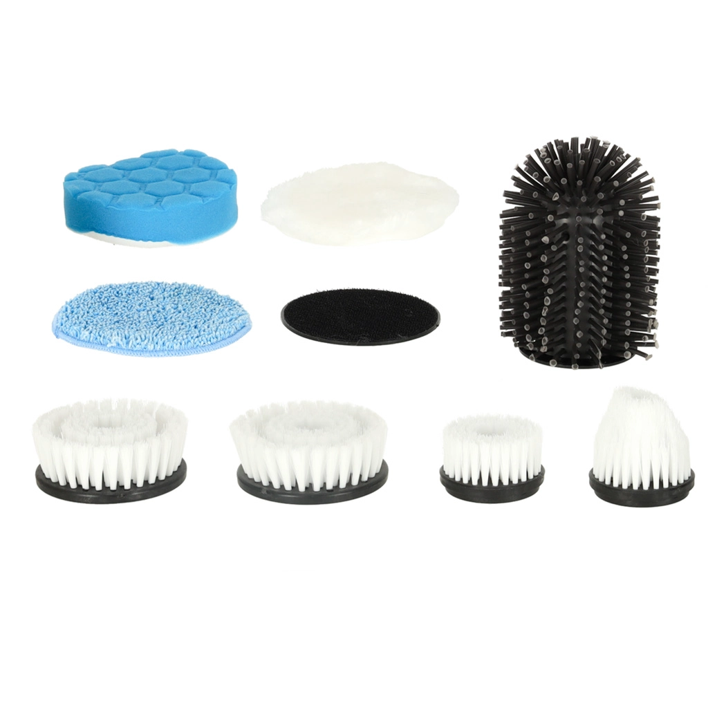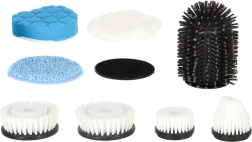 Комплектът включва различни четки и падове за търкане, измиване и полиране. Лесно се справя с плочки, фуги, санитария, стъкло и котлони.