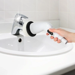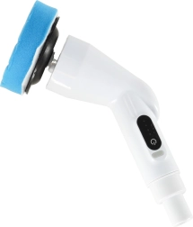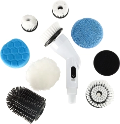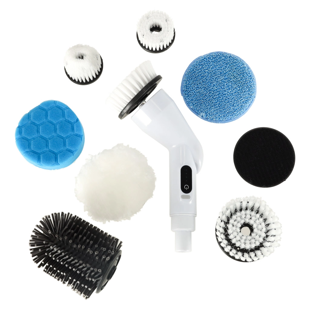 Сменяемите глави включват четки, гъби и полиращи падове за различни повърхности – плочки, фуги, вани, мивки, стъкло и котлони. Вграден акумулатор 3,7 V / 2000 mAh предоставя до 30 минути работа с едно зареждане и се зарежда лесно чрез USB кабел.