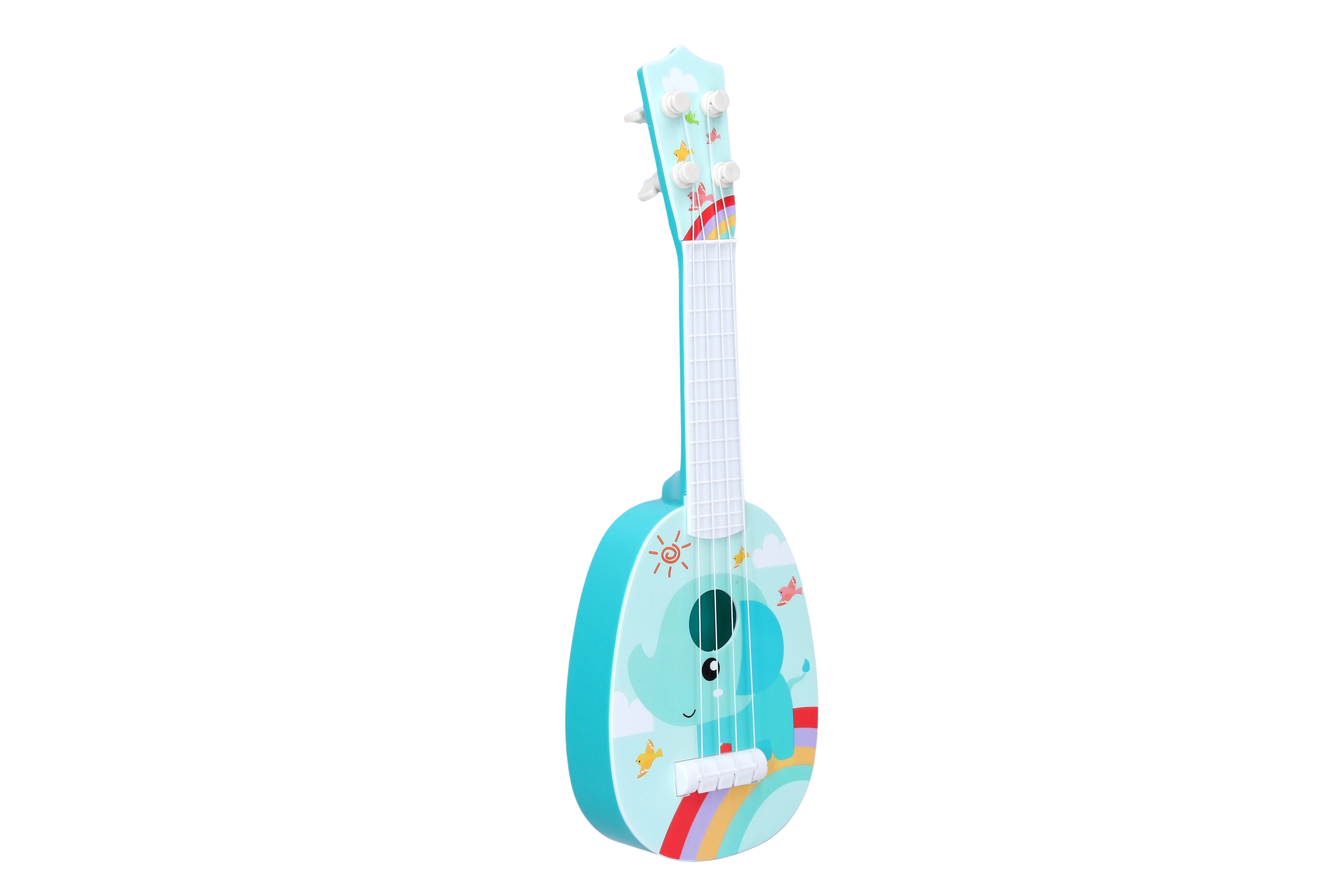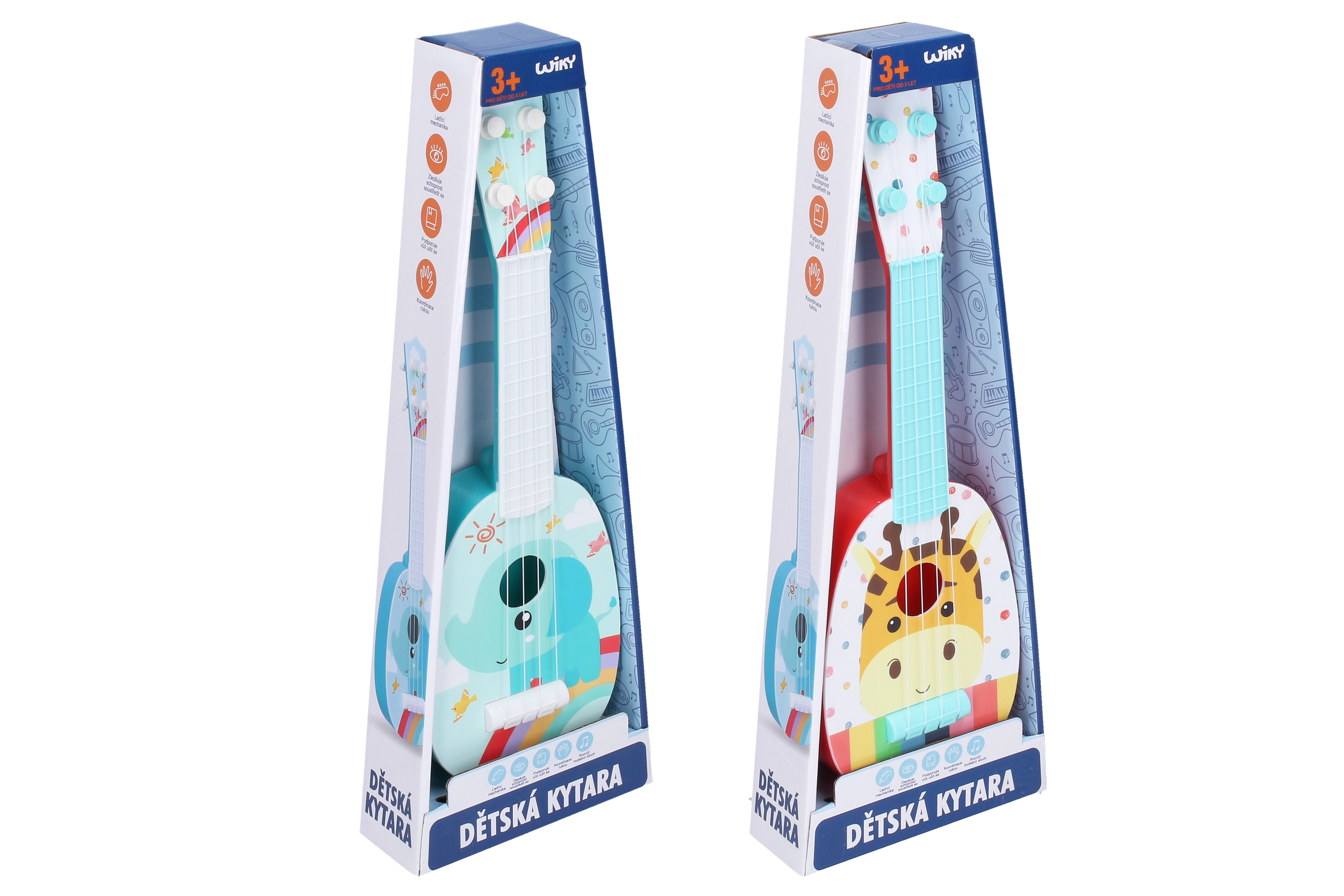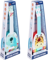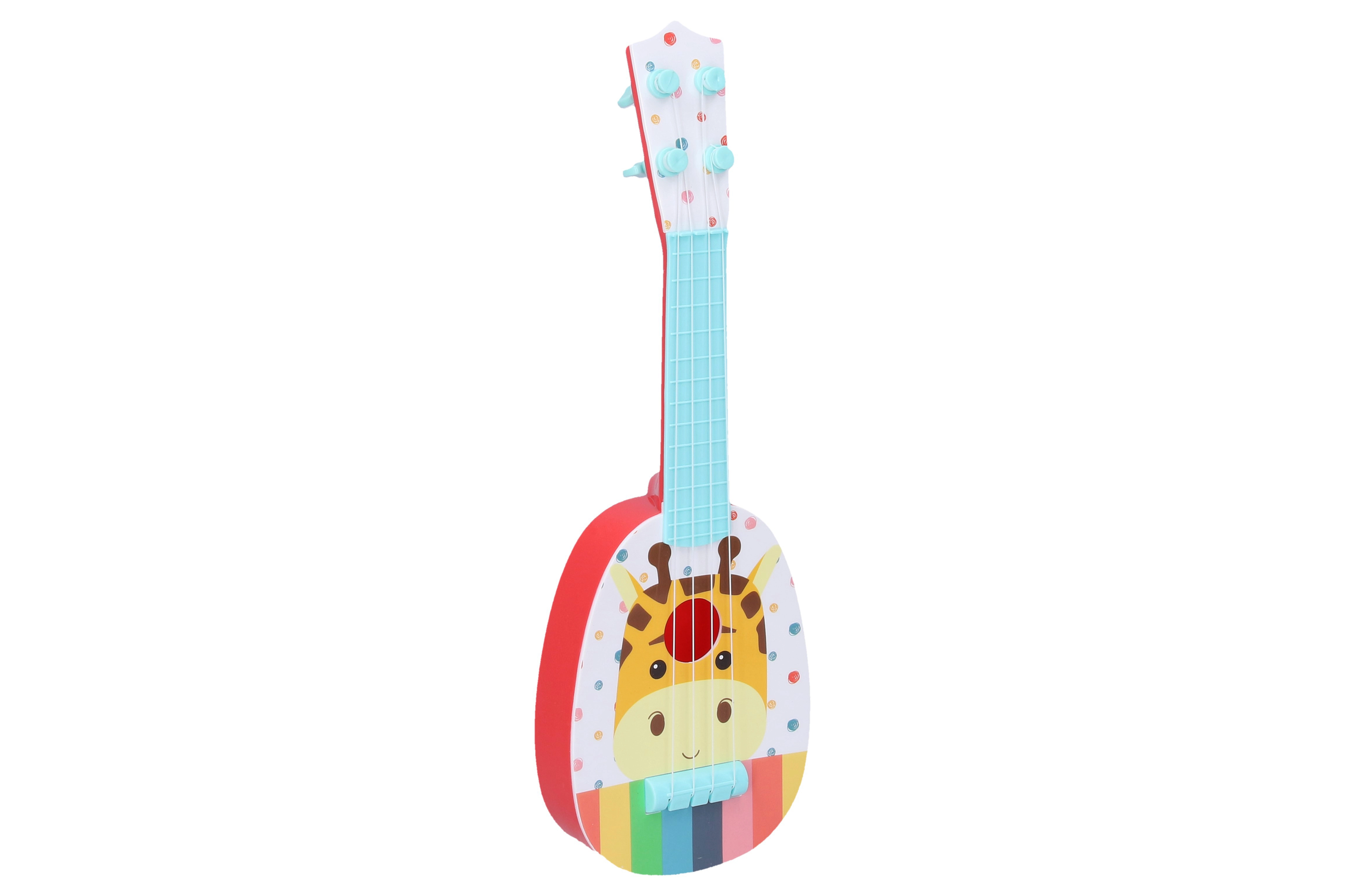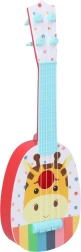 Тази детска китара с мотиви на африкански животни е идеална за малки начинаещи. Има четири синтетични струни и дължина 37 см, което я прави перфектен избор за лесно държане и свирене.
