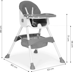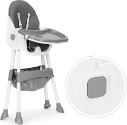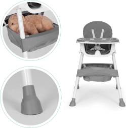 Безопасността се гарантира от 5-точков колан и стабилни метални крака с неплъзгащи се накрайници. Свалящият се двуслоен поднос има повдигнати ръбове и държач за чаша, като горният слой може да се мие в съдомиялна. Сгъваемата конструкция пести място, а кошницата под седалката държи лигавници, кърпички и играчки винаги под ръка.