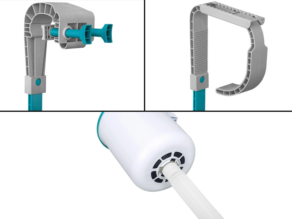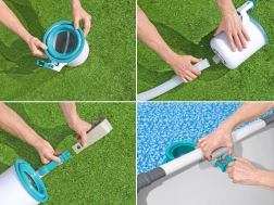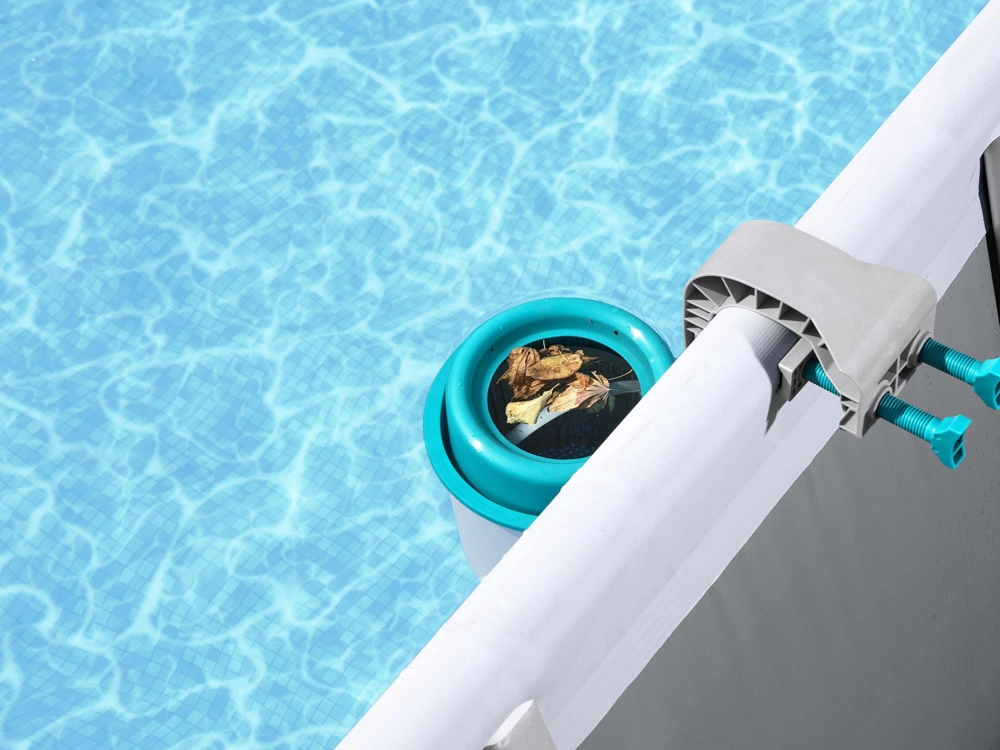 Скимерът се захваща лесно за ръба или стената на надземния басейн и е готов за работа за минути. Регулируемата стойка осигурява правилна височина спрямо водната повърхност.