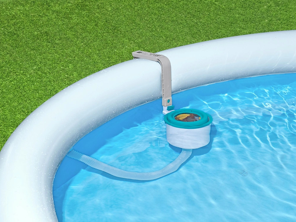 Повърхностният скимер Bestway FlowClear е интелигентно решение за ежедневна поддръжка на водата в надземни басейни. Монтира се на вътрешната стена на басейна близо до всмукването, свързва се към филтърната помпа и скимерът започва непрекъснато да прибира плаващите замърсявания в кошницата. Щом кошницата се напълни, просто я изваждате, изпразвате и продължавате с къпането.