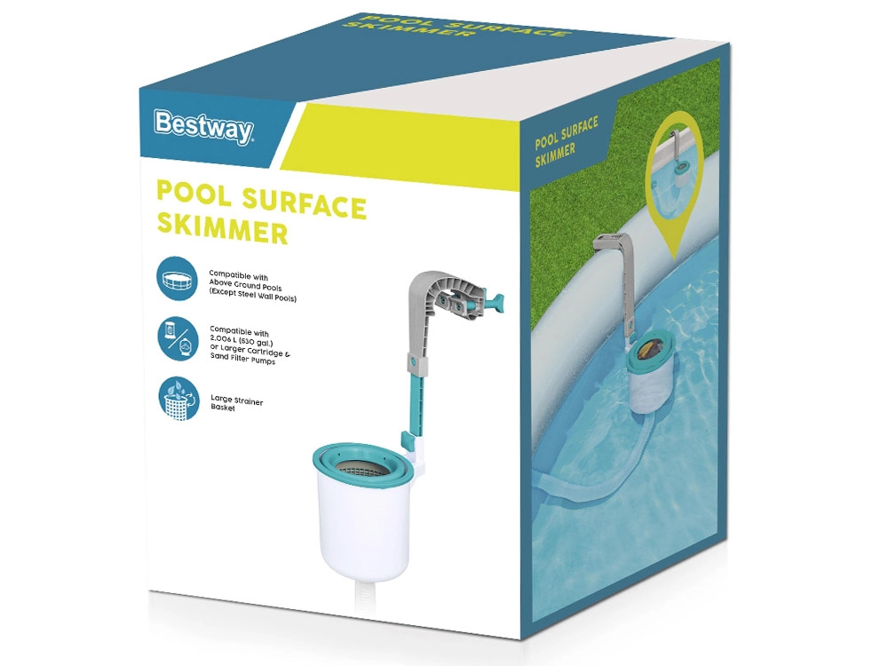 Благодарение на регулируемата монтажна стойка лесно изравнявате нивото на скимера с водната повърхност за максимална ефективност. Корпусът от издръжлива, устойчива на корозия пластмаса е проектиран за дълъг живот и минимална поддръжка. Скимерът е подходящ за всички надземни басейни Bestway с изключение на моделите с метални стени.