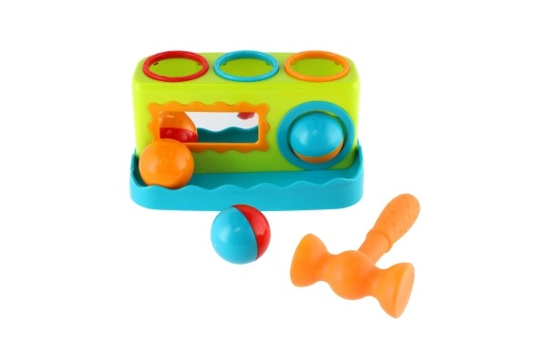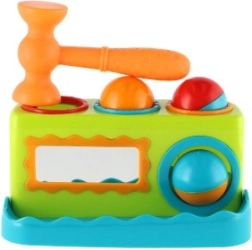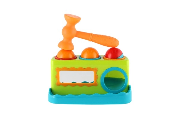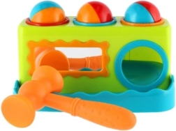 Това цветно пластмасово чукче с дължина 21 см е чудесен избор за първи развиващи игри. Децата безопасно набиват три топчета в подготвените отвори с чукчето, като така тренират захват, сила и точност. Интегрираното огледалце на предната страна повишава взаимодействието и забавлението.