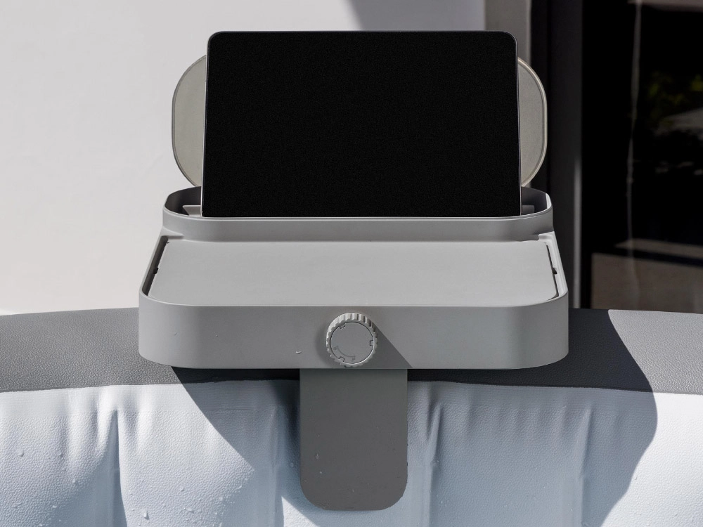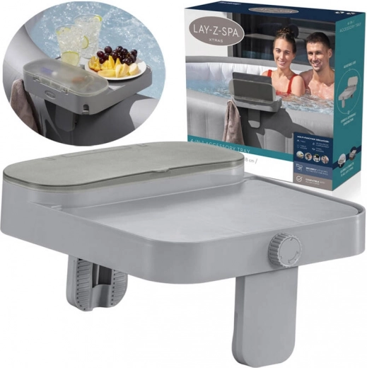 Насладете се на релакс в джакузито без компромиси – многофункционалният рафт Bestway 4 в 1 за всички модели LAY‑Z‑SPA държи напитки, телефон, таблет и дребни вещи винаги под ръка. Предлага поставка/масичка, скрито отделение, устойчиво на пръски, закачалка за хавлии и държач за таблет в едно. Благодарение на регулируемите челюсти (5–25 mm) бързо и стабилно го закрепвате за ръба на джакузито.