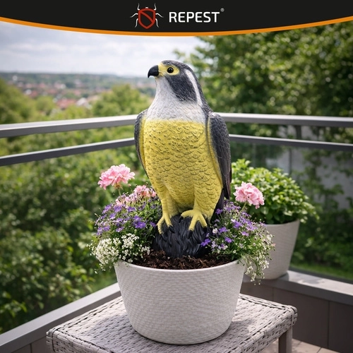 Реалистично плашило срещу птици във формата на сокол ефективно защитава балкони, тераси и градини. Благодарение на детайлната изработка и естественото оцветяване действа като естествен хищник и надеждно отблъсква гълъби, скорци, врабчета, гарги и чайки. То е устойчиво на UV лъчи и атмосферни влияния, може да се натежи с пясък за по-голяма стабилност и лесно да се премества според нуждите.