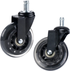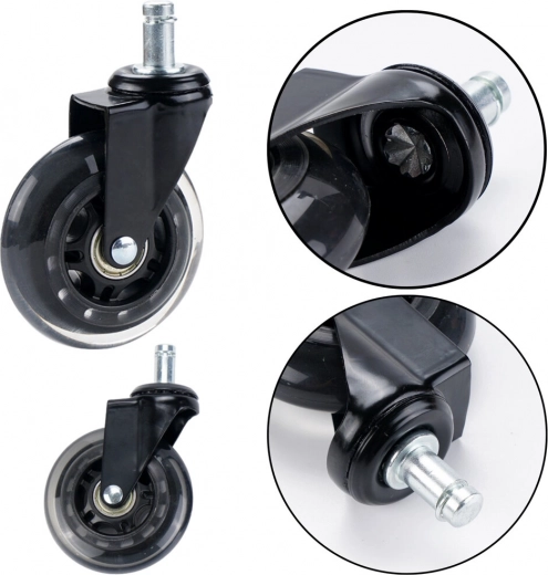 Гумените колелца с мек и еластичен повърхностен слой са идеални за дървени подове, панели, ламиниран паркет, плочки и килими, като ги защитават от повреда. Стабилната метална конструкция на всяко колелце осигурява висока издръжливост с носимост до 50 kg, което гарантира надеждност дори при интензивна употреба в офис и геймърски столове.