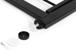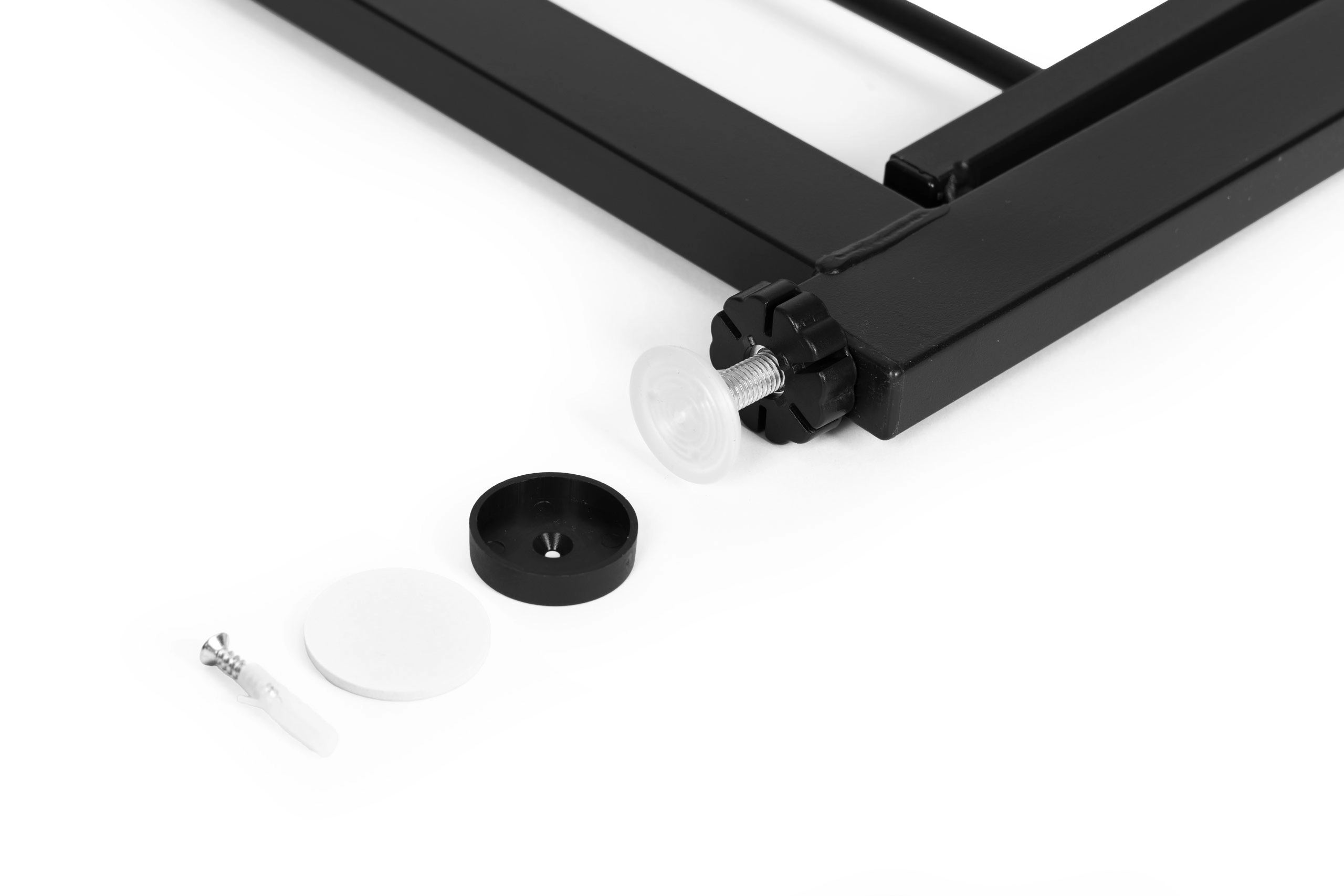 Монтажът е без инструменти и без пробиване благодарение на 4-точковото закрепване под налягане. В комплекта има защитни подложки, които предпазват повърхностите от повреди, както и аксесоари за твърдо завинтване, ако желаете постоянна инсталация. Здравата прахово боядисана стомана осигурява дълъг живот и стабилност.