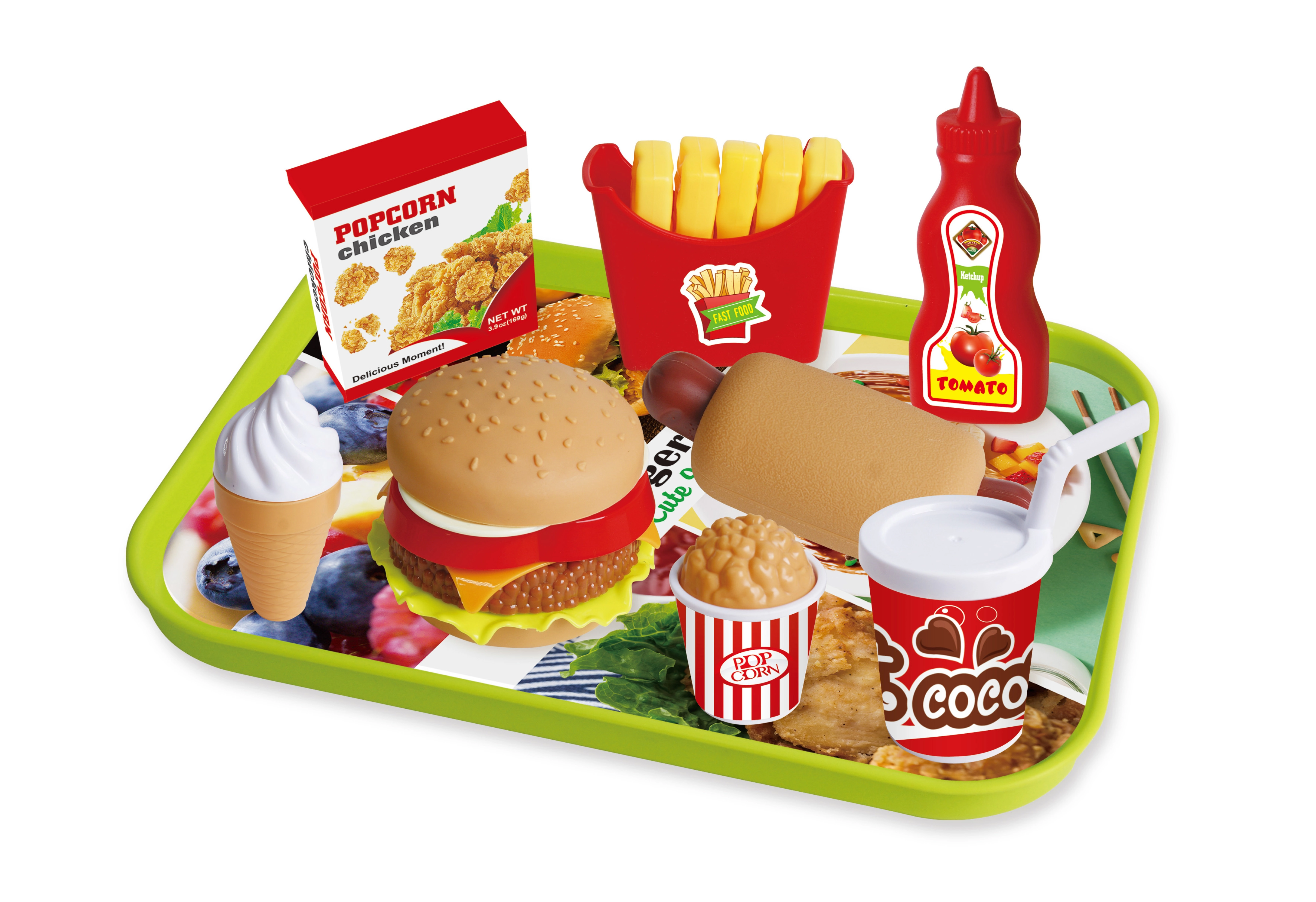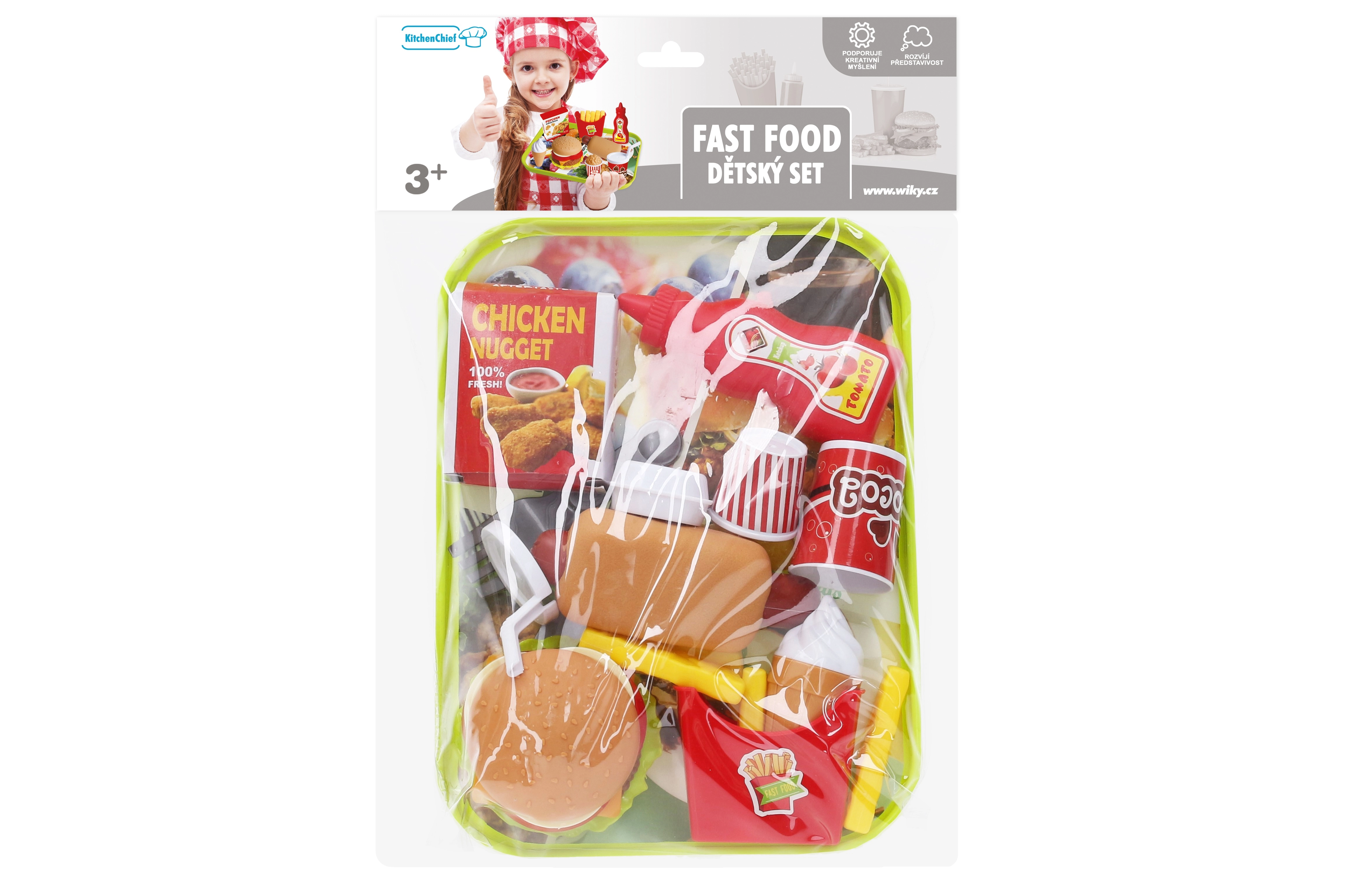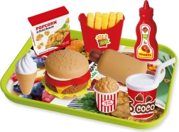 Тази играчка е идеална за малки деца, които обичат да си представят, че сервират любими бързи храни. Комплектът включва редица апетитни „порции“, които изглеждат като истински: