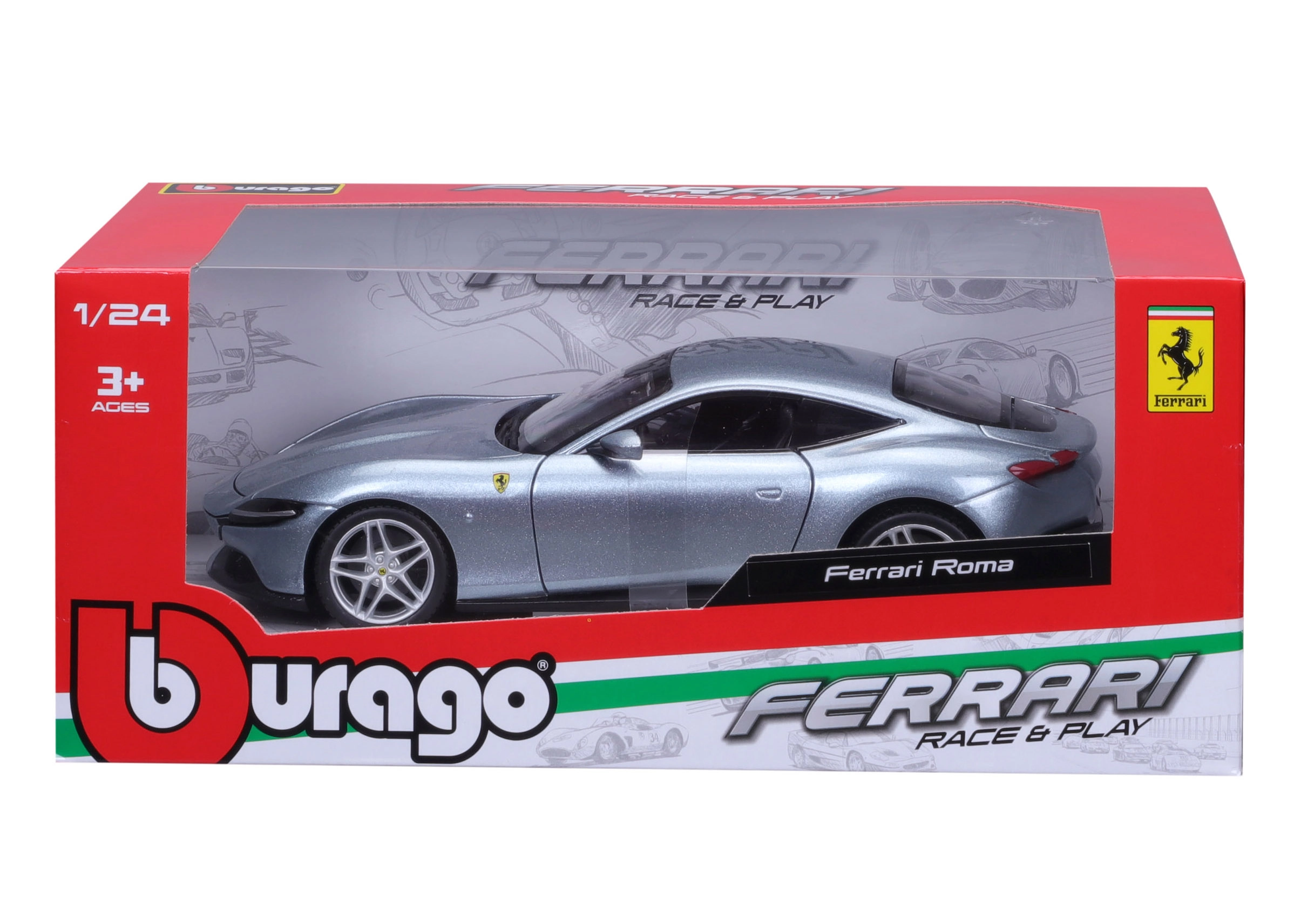 Представяме ви сив модел на автомобила Ferrari Roma в мащаб 1:24 от реномираната марка Bburago. Този модел е детайлна реплика на луксозния автомобил и предлага страхотно изживяване за всеки колекционер: