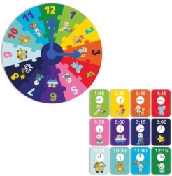 Цветен образователен пъзел във формата на часовник за деца от 3 години, вдъхновен от сериала COCOMELON. Помага за развитие на фината моторика, разпознаването на форми и цветове и запознава децата с основите на измерването на времето по забавен начин.