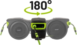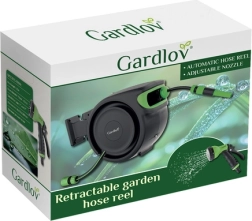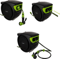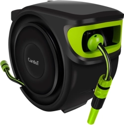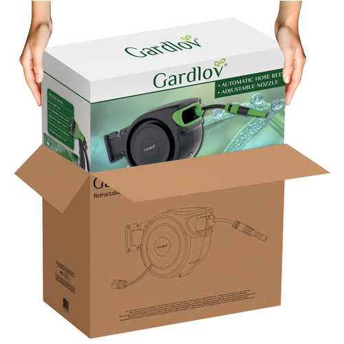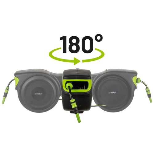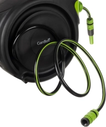 Комплектно решение за градината – сетът включва автоматична макара, 25 m градински маркуч, 2 m подаващ маркуч, бързи връзки 1/2", универсален накрайник за чешма, стенна стойка с 180° завъртане и монтажни дюбели. Благодарение на плавното, контролирано навиване и блокировката на пистолета работата е бърза, чиста и безопасна.