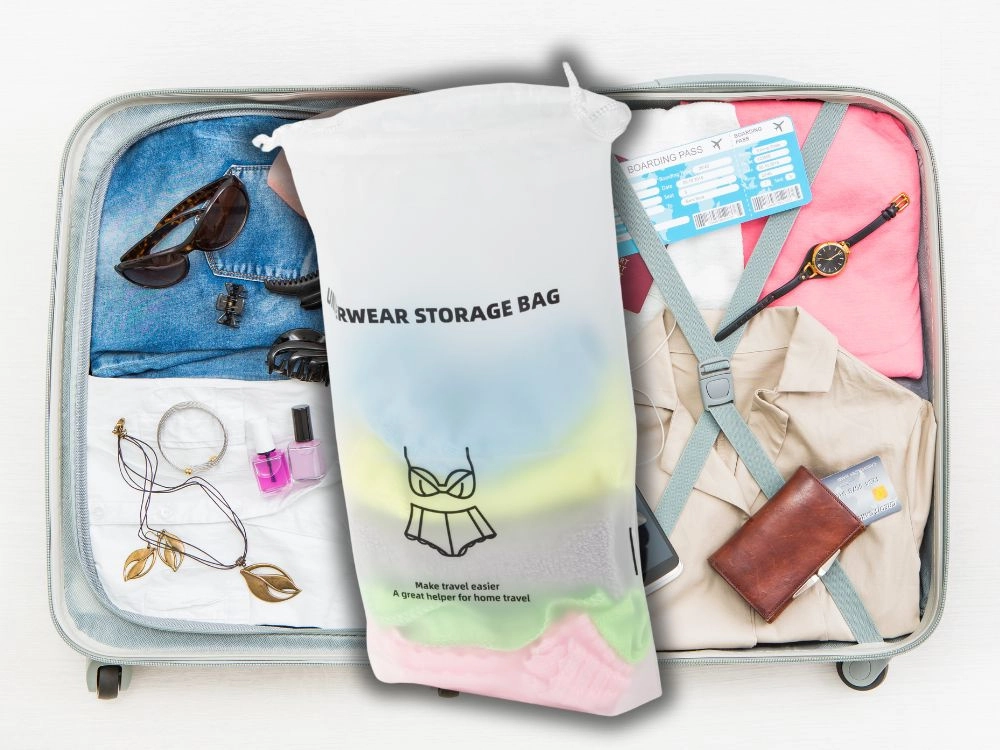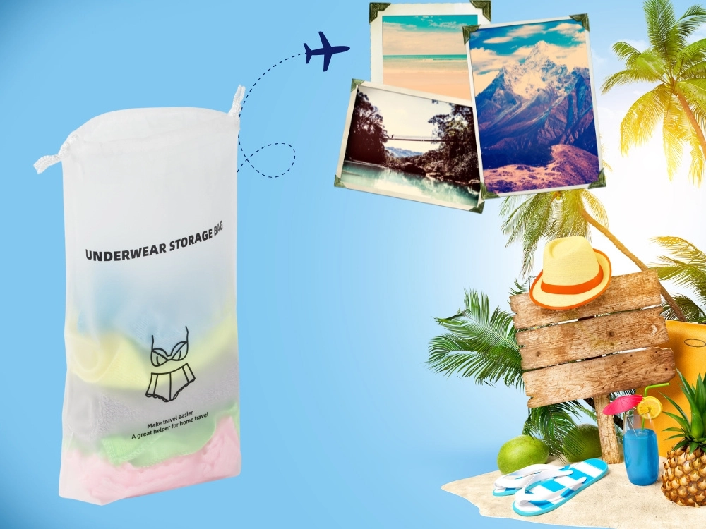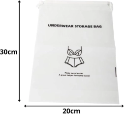 Поддържайте ред по време на път с практичния органайзер за бельо. Благодарение на водоустойчивия материал съдържанието остава сухо и чисто, а леката изработка и стягането с връзки осигуряват лесна употреба. Идеален за куфар, самолет и спортна чанта.