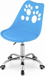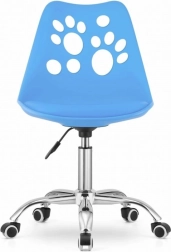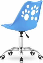 Въртящ се син пластмасов стол с метална основа и декоративни изрези във форма на лапи, идеален за домашни офиси или детски стаи.
