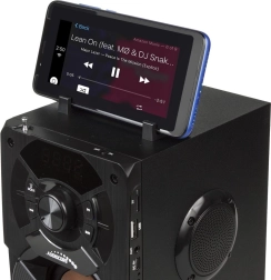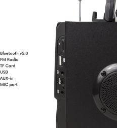 За удобно ползване има практична дръжка, интуитивни бутони на корпуса и дистанционно управление. Интегрираната батерия 2000 mAh осигурява до 3–4 часа възпроизвеждане и се зарежда лесно чрез USB (5 V/1 A). Горната част на говорителя може да се използва като поставка за телефон, така че възпроизвежданото съдържание винаги е пред очите ви.