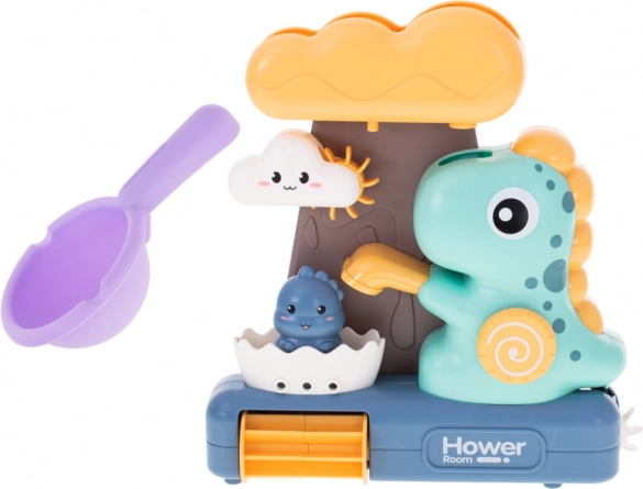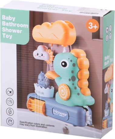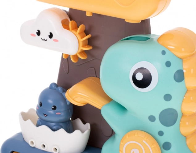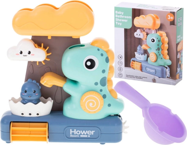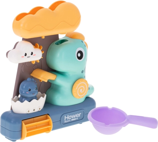 Детската играчка за къпане с динозаври и водно колелце е чудесен начин да разнообразите къпането на малките деца. Играта се състои в наливане на вода в горния съд във формата на голям облак, откъдето водата свободно преминава през всички части на играчката, осигурявайки визуално забавление за децата.