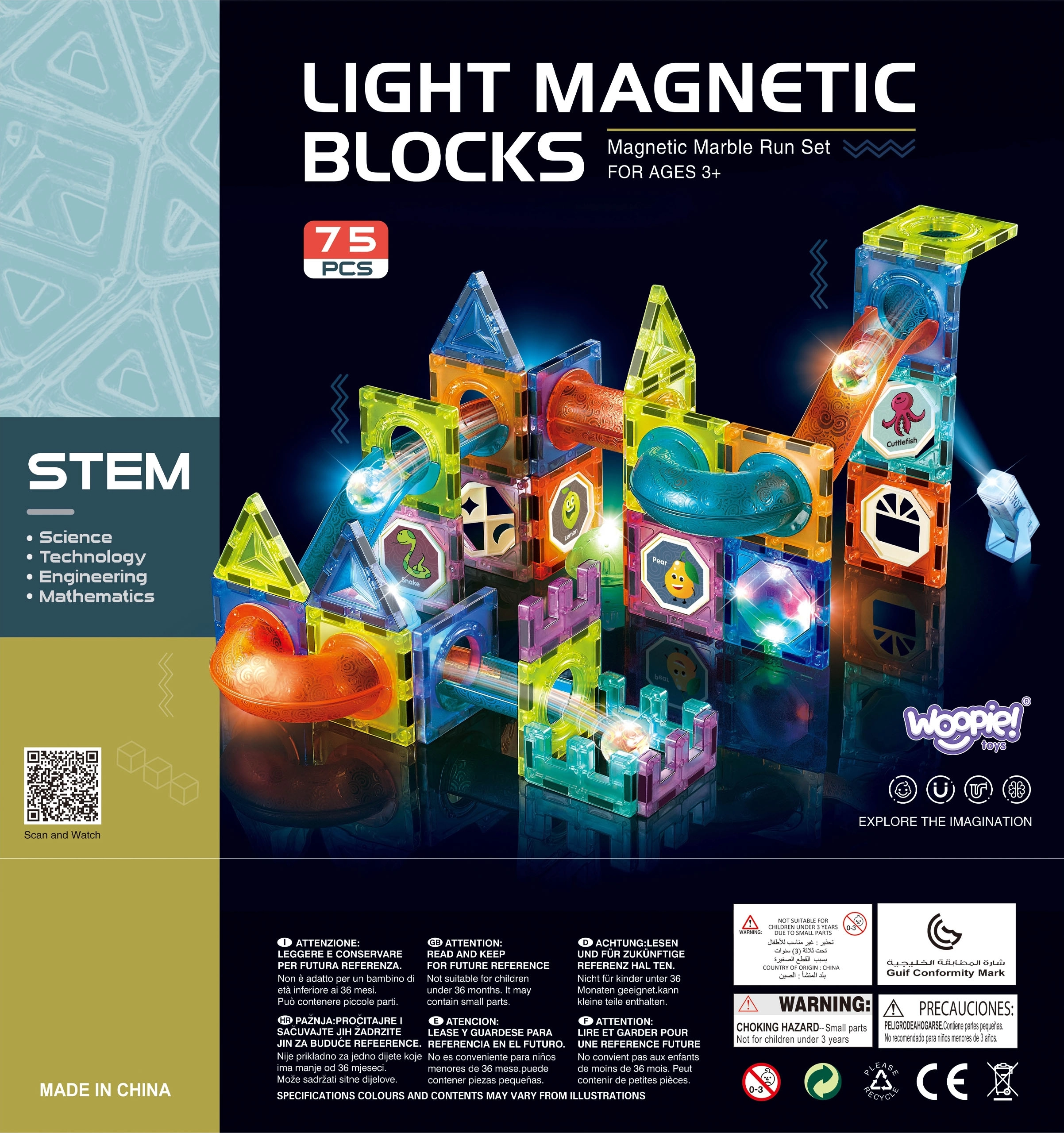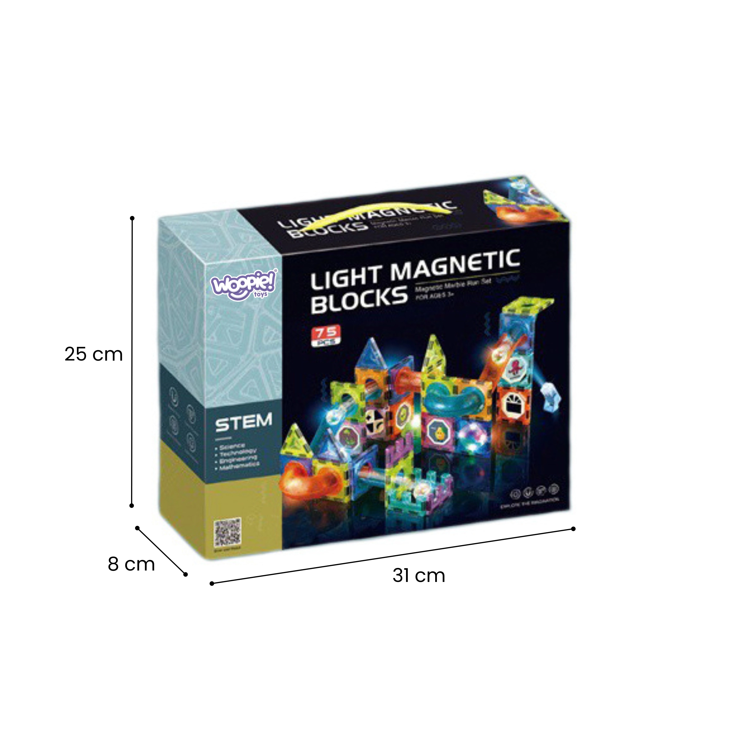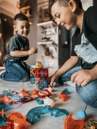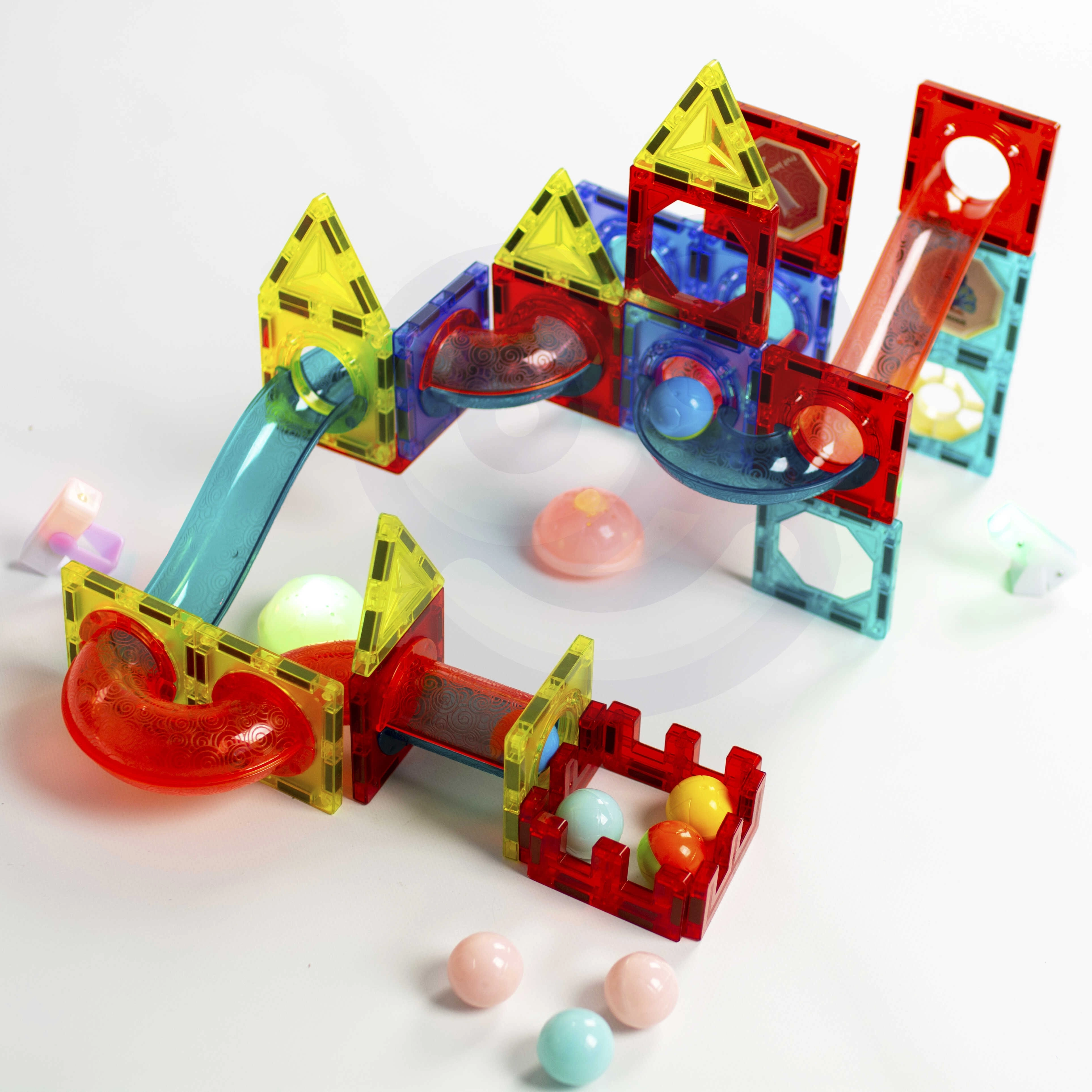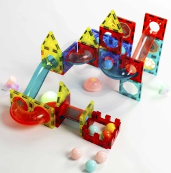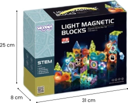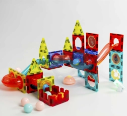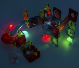 Този магнитен конструктор предлага богат набор от части за създаване на оригинални конструкции и динамични писти за топчета. Благодарение на светещите топчета и рефлекторите се получава ефектно „светещо“ трасе, което привлича децата и удължава времето за игра. Силните магнити осигуряват здраво свързване, така че и по-сложните 3D конструкции стоят стабилно.