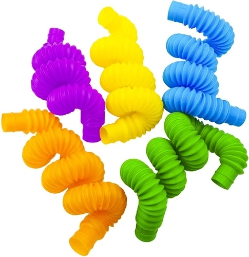 Тези тръбички не само се свързват, но могат и да се разтягат, а сгъването и разгъването издава приятен звук. Това ги прави перфектни играчки за освобождаване от напрежение и развитие на игривата креативност.