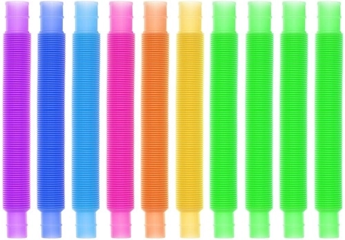 Този комплект от 10 сензорни тръбички е създаден да осигури тактилна и слухова стимулация. Тръбичките, налични в 7 различни цвята – жълт, розов, лилав, оранжев, син, тъмносин и зелен, са идеални за образователни игри като учене на букви, броене и други. Способността им да се свързват позволява създаване на различни форми като кръгове и квадрати, което насърчава детското творчество и гарантира часове забавление. За възрастни служат като чудесен инструмент за облекчаване на стреса.