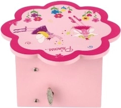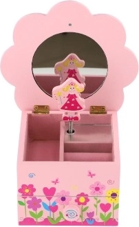 Очарователната дървена кутия за бижута в розов цвят ще зарадва всяка малка любителка на приказки. Капакът с цветна форма крие огледалце, а при отваряне се включва музикален механизъм, който превръща всяко пременяне в магичен ритуал. Вътрешното разпределение с отделения и долното чекмедже помагат да се поддържа ред в пръстенчета, гривни, мъниста и дребни съкровища.