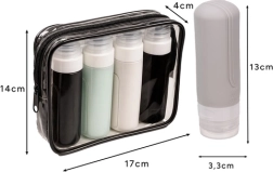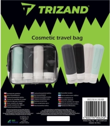 Представяме практичния пътен козметичен комплект на марката Trizand, който е перфектен за всички ваши нужди при пътуване. Това е комплект от четири силиконови бутилки и прозрачна водоустойчива чанта, които отговарят на стандартите TSA/IATA за превоз на течности в ръчния багаж. Край на притесненията за разлян шампоан в куфара!