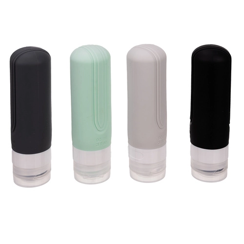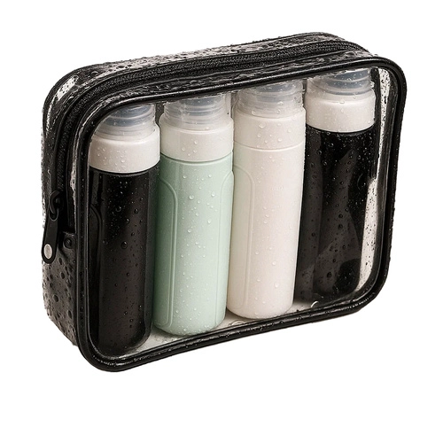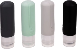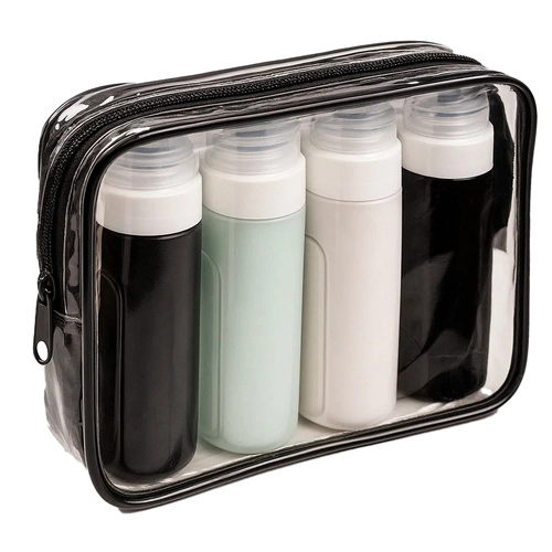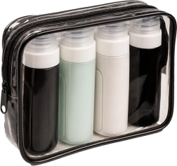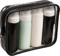 Пътен козметичен комплект с четири гъвкави бутилки, които са в съответствие с изискванията за въздушен транспорт, водоустойчиви и идеални за самолет. Носи удобство и организация по време на път.