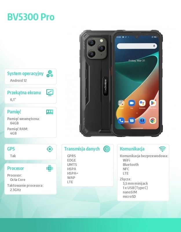 Blackview BV5300 Pro е здрав смартфон, идеален за потребители в взискателни условия. Благодарение на сертификатите IP68, IP69K и военния стандарт MIL-STD-810H е защитен от прах, вода и механични повреди. Въпреки здравата си конструкция е лесно преносим благодарение на компактните размери и тегло от 273 g.