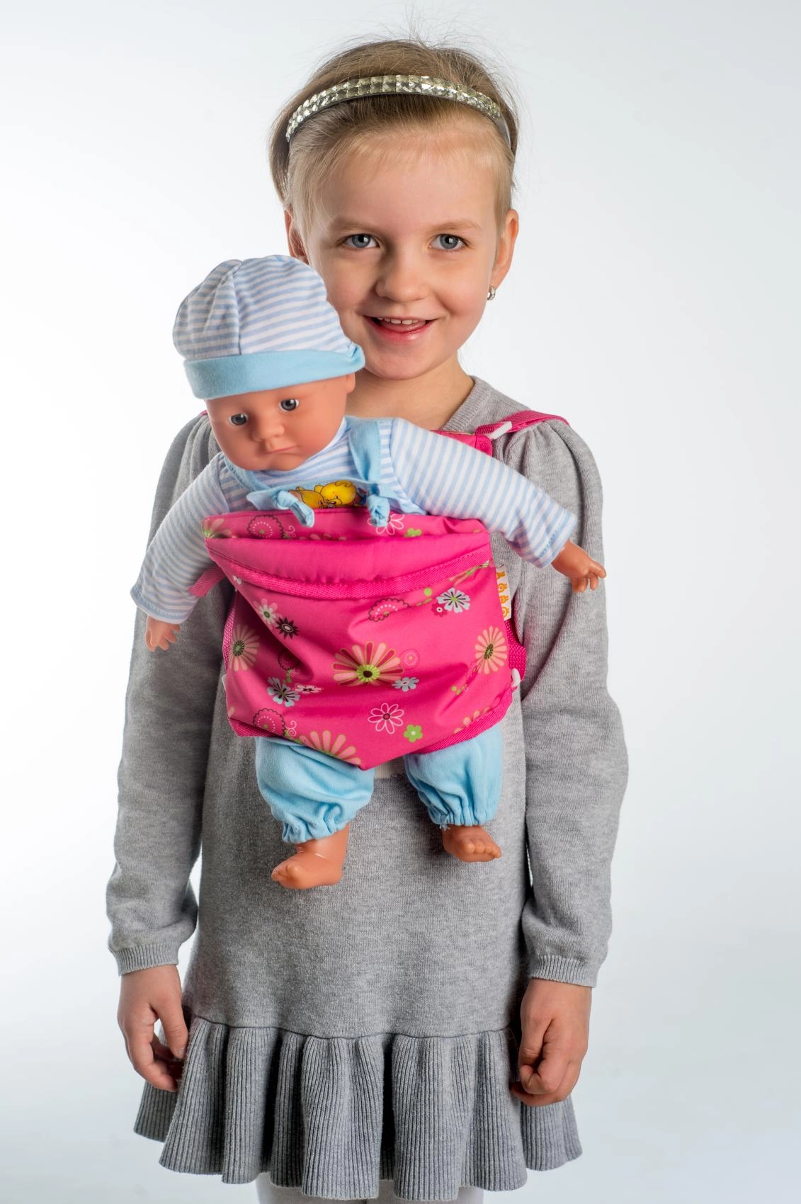 Благодарение на регулируемите презрамки носилото се адаптира към деца с различен ръст, а здравият преден джоб с размер 29 × 20 см побира повечето стандартни кукли и плюшени играчки. Чудесно за у дома, в парка и на гости – играчката ще е винаги под ръка.