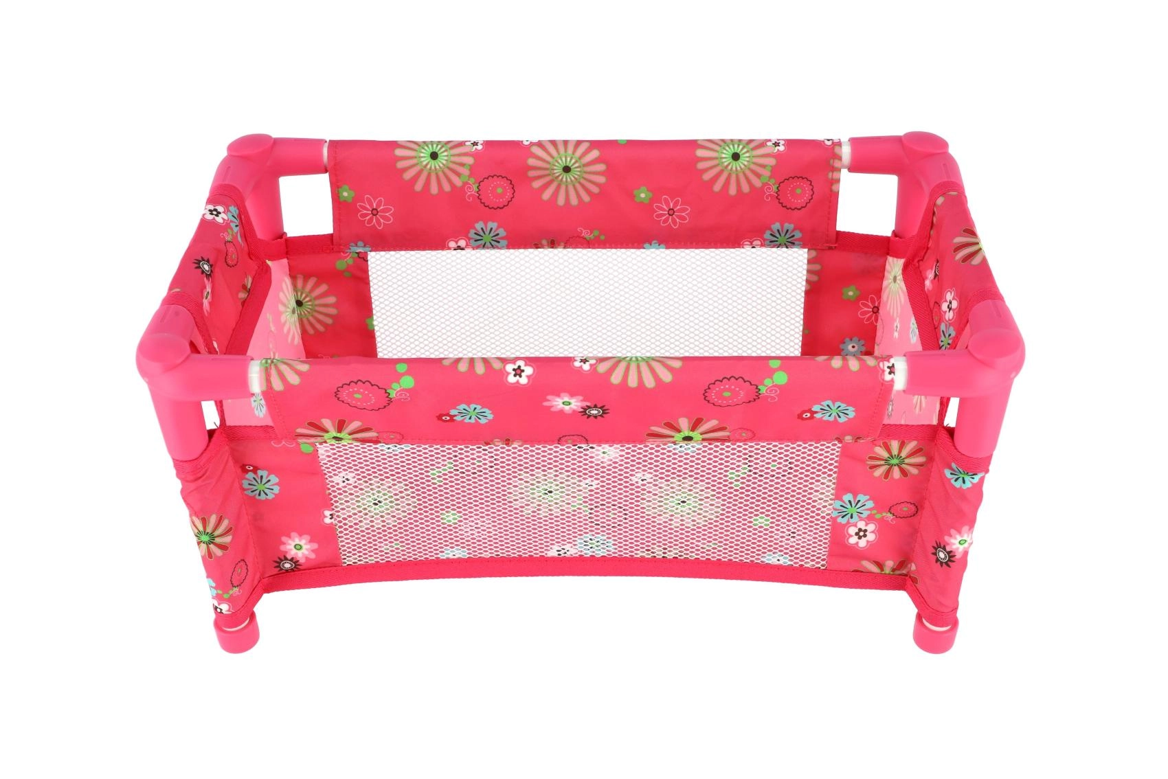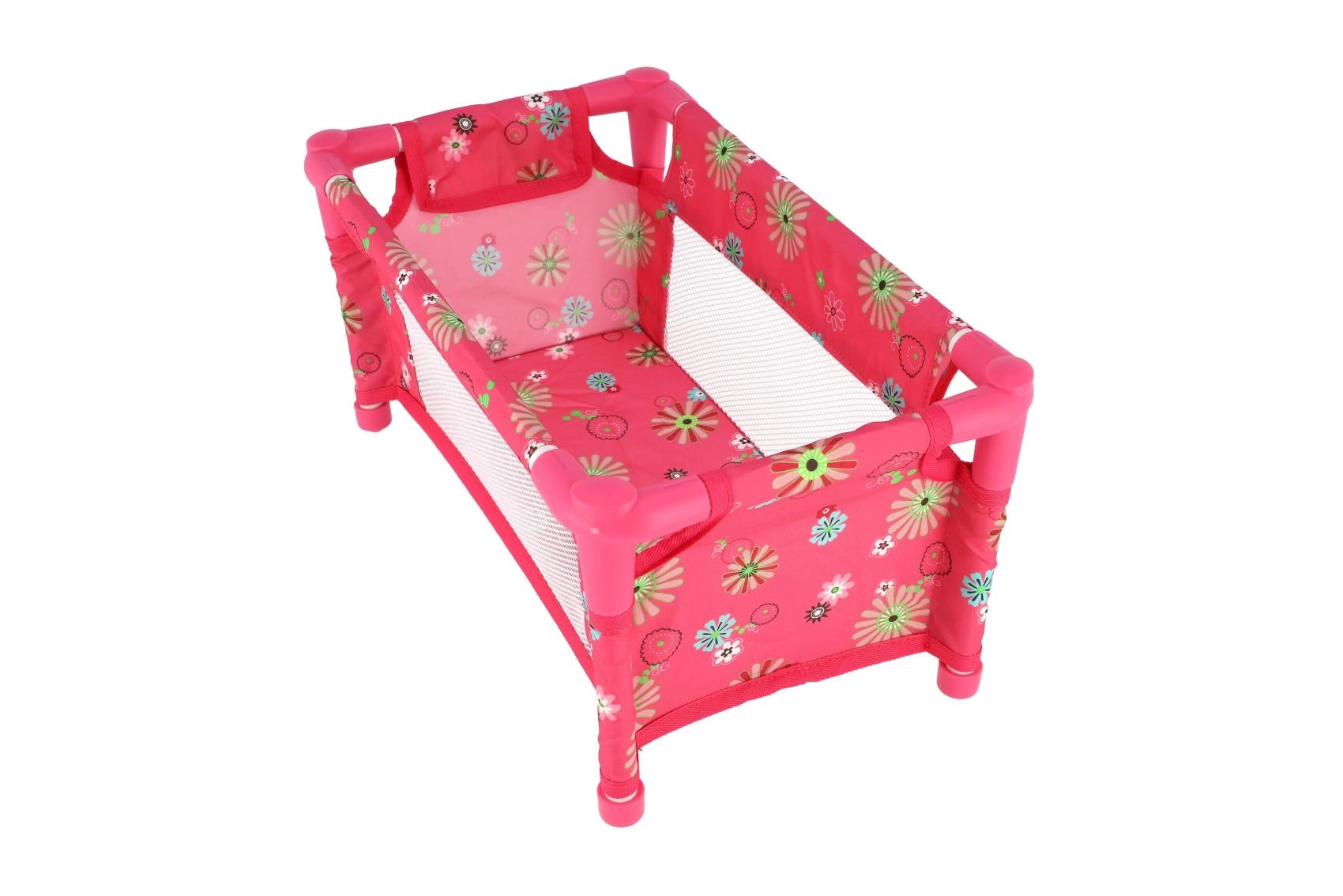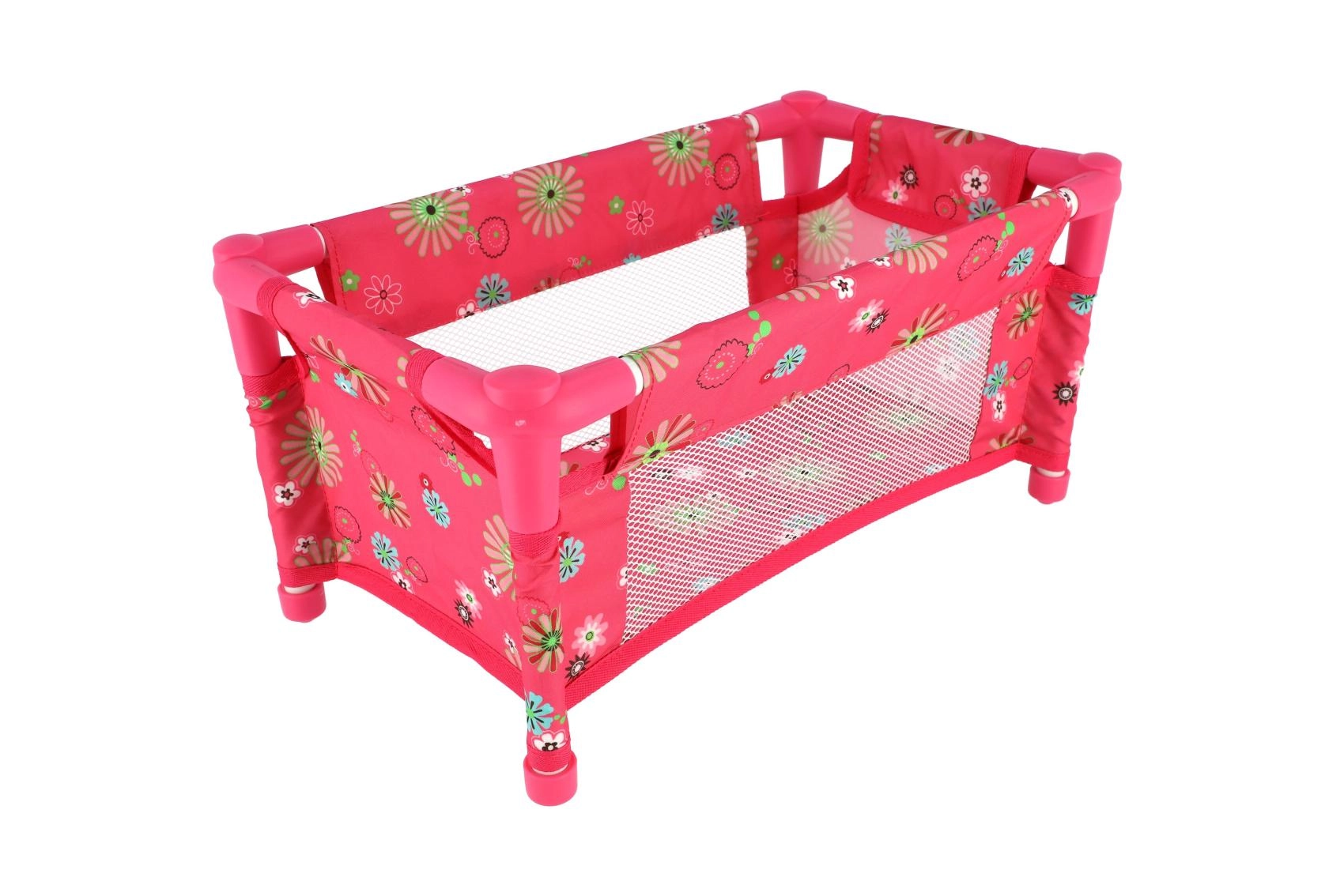 Здрава, но лека конструкция от тръби и текстилни панели издържа на ежедневна игра. Легълцето е без матрак (без твърдо дъно), което го прави безопасен и гъвкав аксесоар за детската стая. Веселият флорален мотив в розови тонове ще зарадва всяка малка майка.