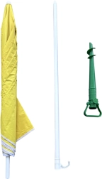Двуделната конструкция с плавна регулация на височината 140–180 см позволява да адаптирате сянката спрямо позицията на слънцето. Практичният връх и почвеният анкерен винт гарантират стабилност в пясък и почва, докато сгъваемият дизайн улеснява транспорта и съхранението. Сгънатият чадър има компактни размери и удобно се побира в автомобил.