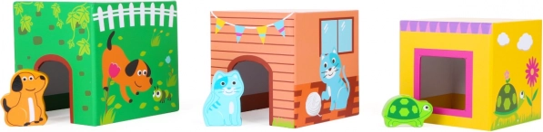 Пъстър комплект за подреждане с картонени кубчета и шест дървени животни за най-малките. Децата подреждат от най-голямото към най-малкото и тренират фина моторика, координация око–ръка и логическо мислене. Всяко животинче намира своя правилен дом в съответния отвор. Безопасна играчка за деца от 12 месеца.