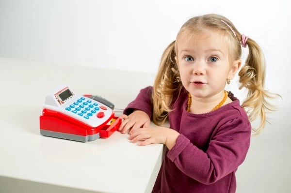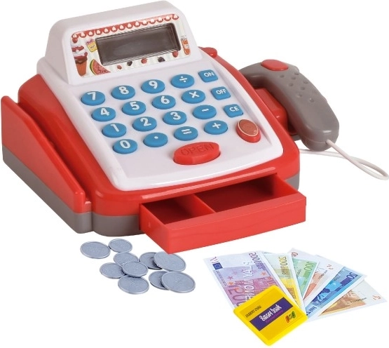 Този компактен дигитален касов апарат е чудесно допълнение към всеки детски магазин. Благодарение на реалистичните функции децата ще изпробват работа с пари, сканиране на стоки и основни сметки. Касата е изработена от издръжлива пластмаса, лесна за управление и впечатлява със своите светлинни и звукови ефекти от пръв поглед.