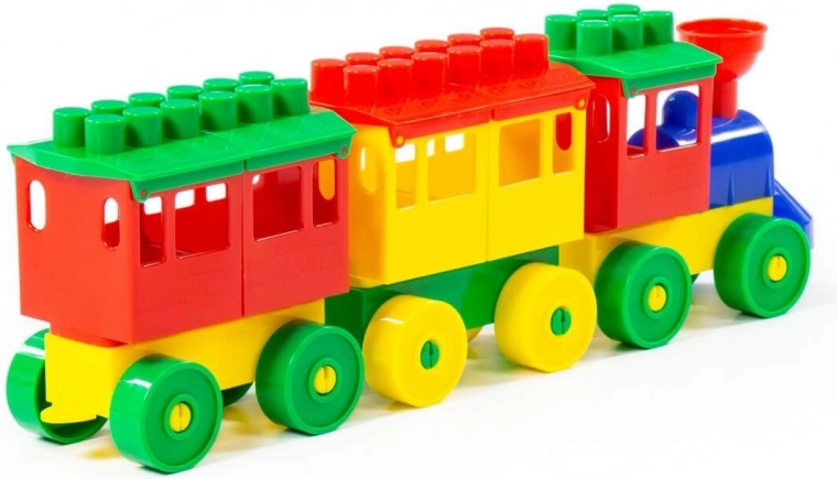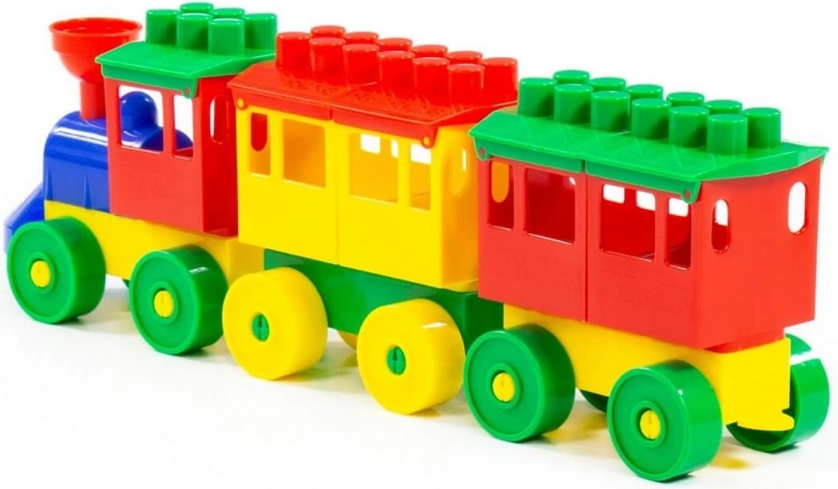 Цветният пластмасов влаков комплект е идеален за малки деца от 3 години. Комплектът включва локомотив и два вагона, което позволява на децата да развиват креативността и фината моторика.