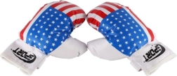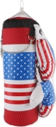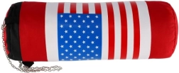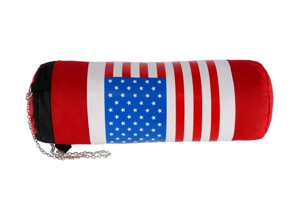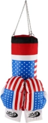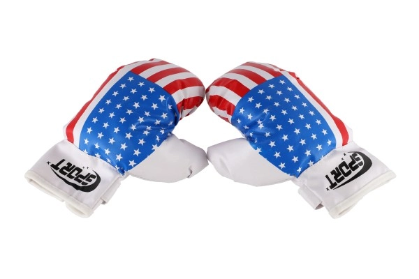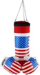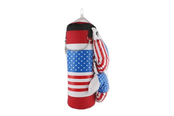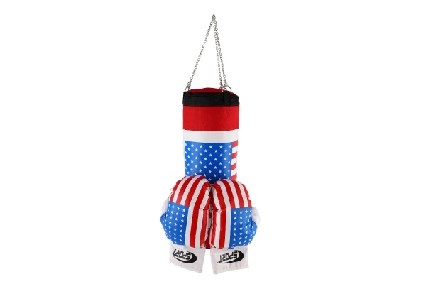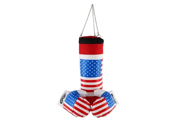 Боксовият чувал и ръкавиците са с мотив на американското знаме, което придава игрив и цветен вид.