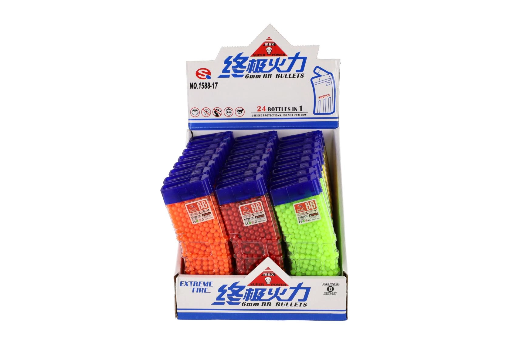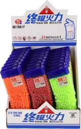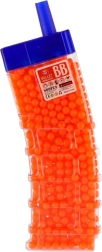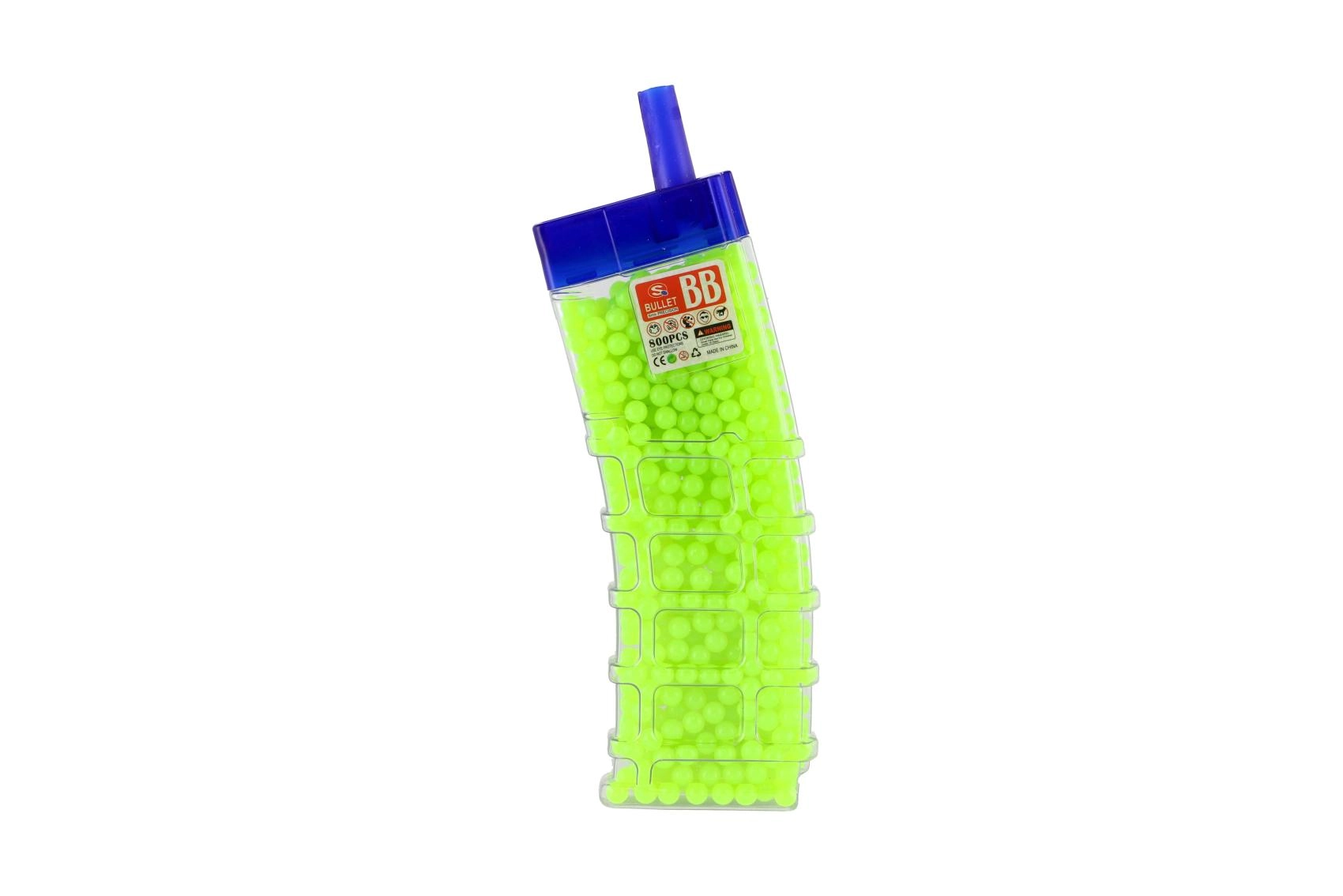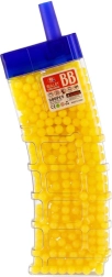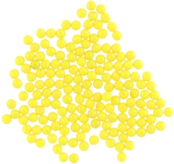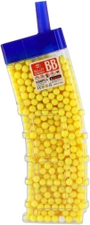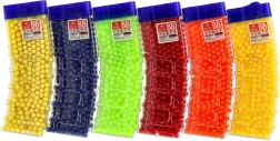 Този универсален комплект топчета 6 mm предоставя достатъчно муниции за продължителна игра. Цветният вариант (жълто, синьо, зелено, червено, оранжево и др.) повишава прегледността и забавлението по време на игра. Прозрачната пластмасова кутия с практично изсипващо гърло улеснява пълненето на детски играчки и едновременно защитава съдържанието от разсипване.
