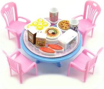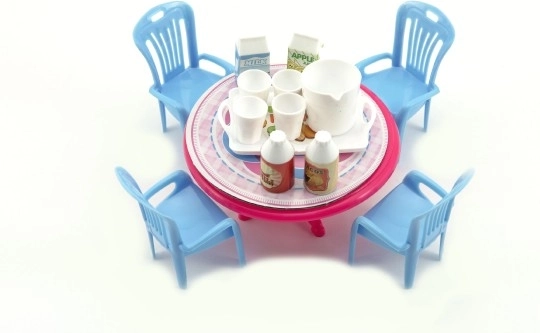 Този комплект мебели за кукли внася в играта красива масичка със столчета и малки аксесоари. Благодарение на компактния размер 12 см перфектно пасва на по-малки кукли и къщички. Леката пластмасова изработка е издръжлива и лесна за поддръжка.