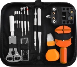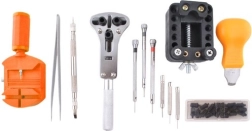 Включва различни отвертки, инструмент за вадене на пинове, пинсета, нож за капаци и други аксесоари за прецизни ремонти на часовници.