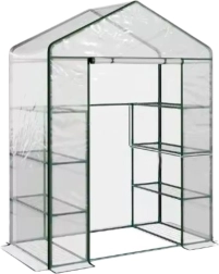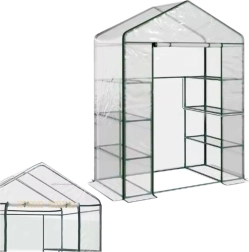 Моделът включва 4 странични рафта и 2 свободни зони на пода, което позволява съхранение на по-високи саксии или отглеждане на катерливи растения. Практичната врата с цип улеснява достъпа навътре, а конструкцията с „T“ сглобки осигурява бърз и интуитивен монтаж без използване на инструменти.