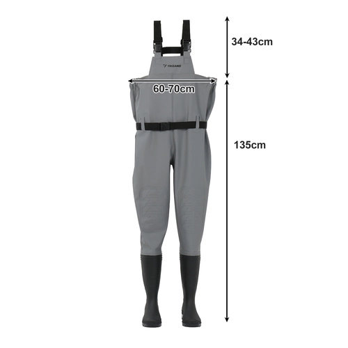 Този комплект за газене е оборудван с подметка против хлъзгане, която осигурява отлична сцепляемост върху хлъзгави, каменисти или кални повърхности, а благодарение на интегрираните ботуши не е нужно да се притеснявате от разлепване или напукване. Панталоните са също устойчиви на повреди, така че могат да се използват с увереност в труден терен за дълго време.
