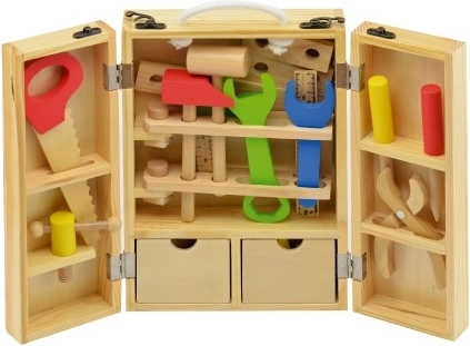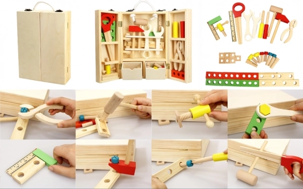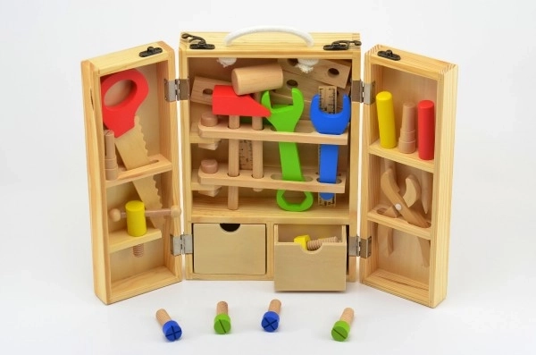Дървени инструменти за деца в практично куфарче! Страхотен комплект за малките сръчковци, който развива моториката и креативността.