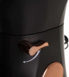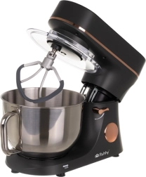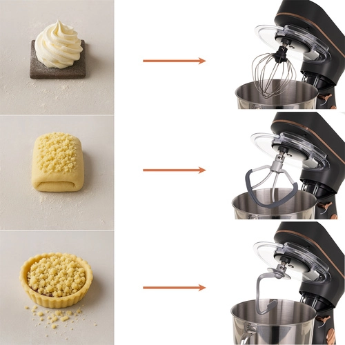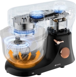 - Богат комплект аксесоари: кука за тесто, бъркалка, балонена бъркалка, капак за купата, шпатула, разделител за яйца, сладкарски пош с 24 накрайника в органайзер.