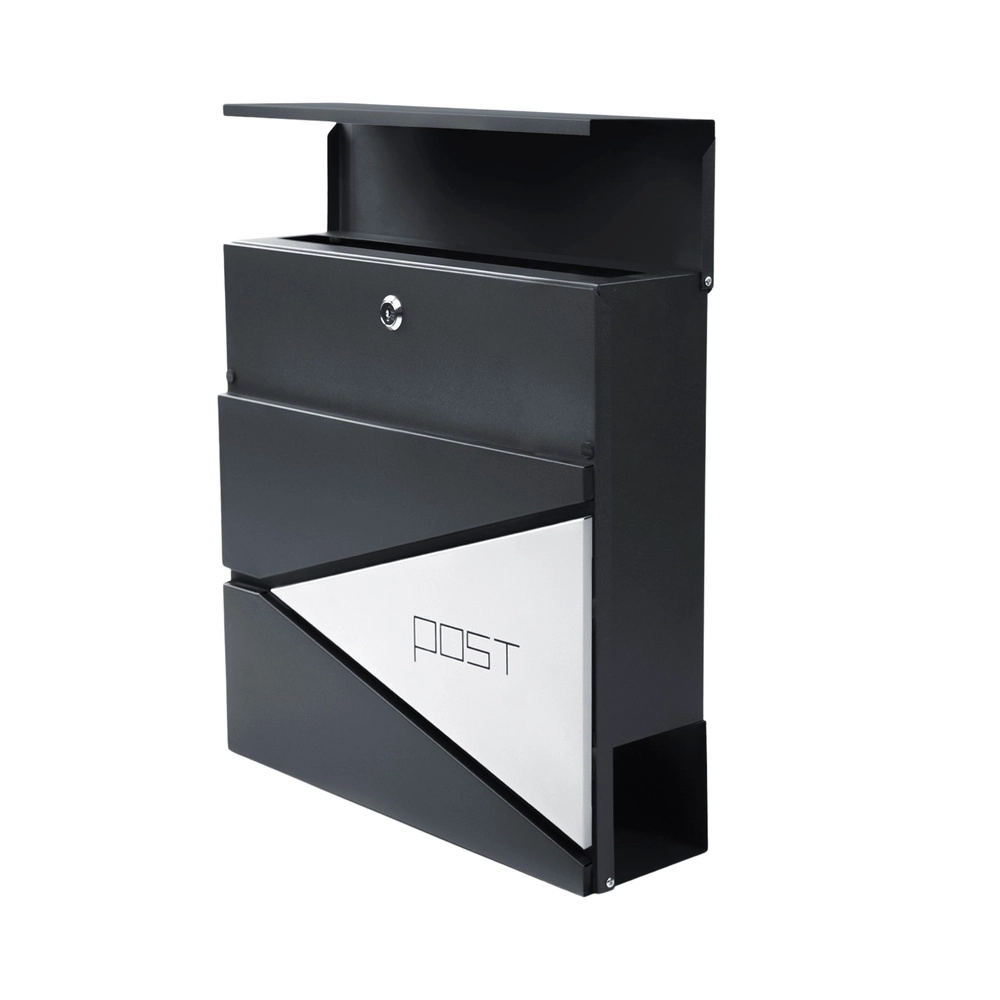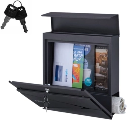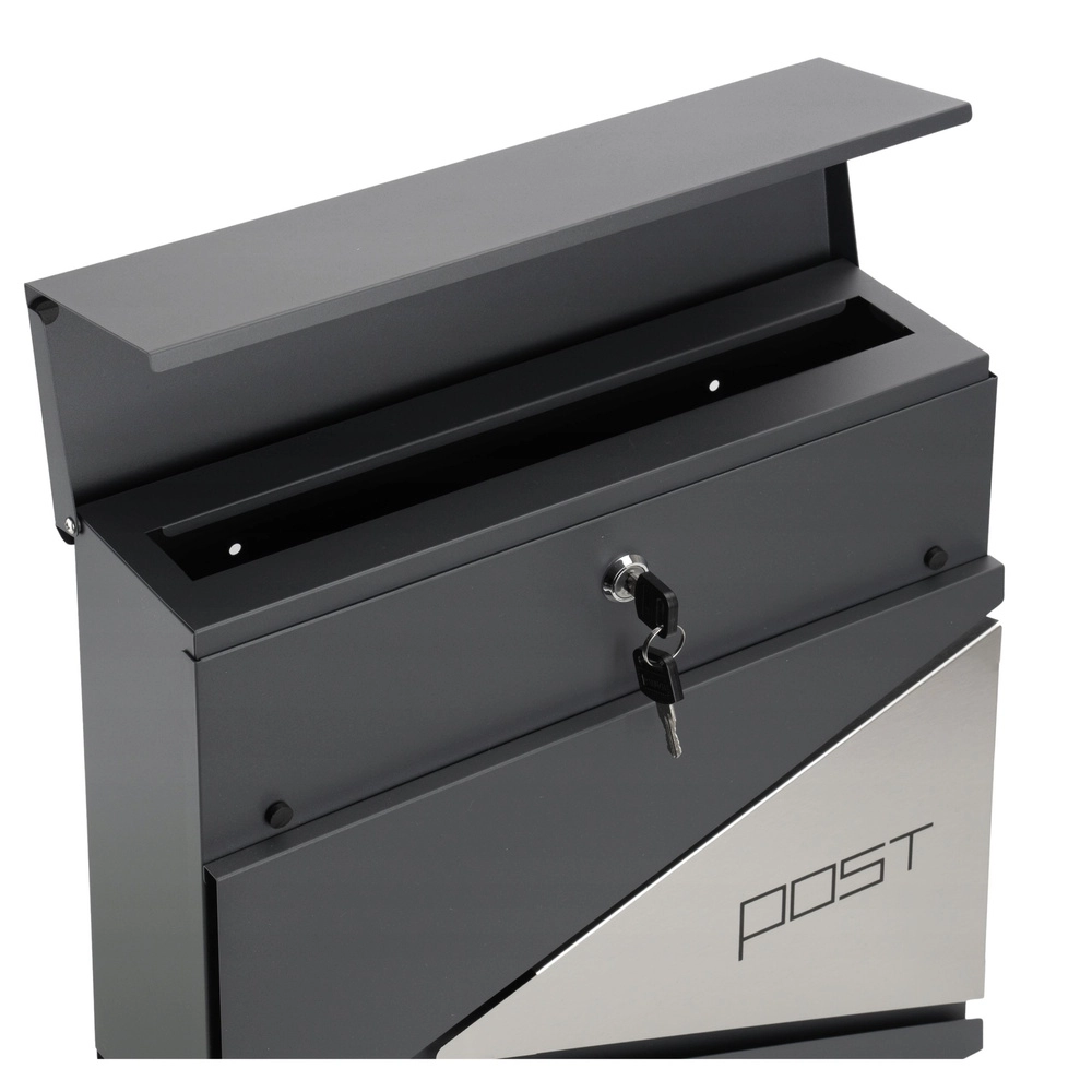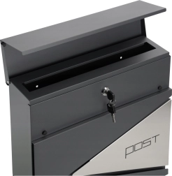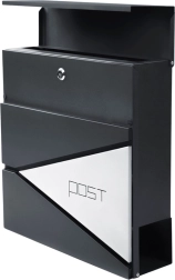 Стилна пощенска кутия в антрацит, която съчетава модерен вид и практични детайли. Изработена е от висококачествена поцинкована стомана с прахово покритие, което я прави устойчива на корозия, атмосферни влияния и механични повреди. Побира формат A4, има широк отвор за пускане 3,5 cm и отделен държач за вестници в долната част. Сигурното затваряне е осигурено от заключване с два ключа.