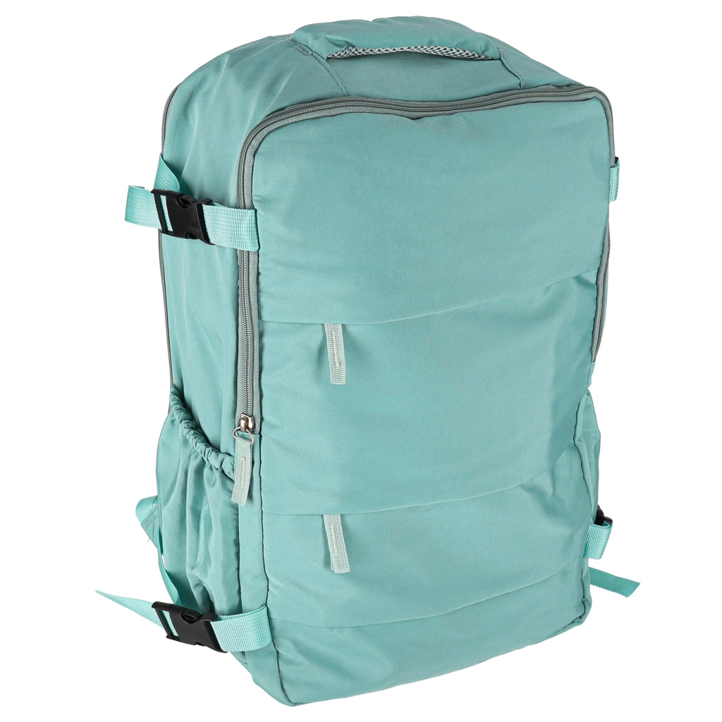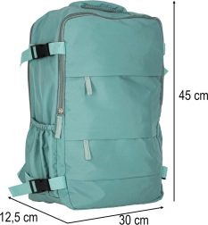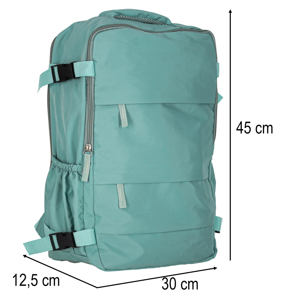 Практична пътна раница с размери 45 × 30 см предлага три отделни отделения, четири външни джоба и странични държачи за бутилка. Благодарение на компресионните ремъци, удобните подплатени презрамки с мрежа и издръжливия материал Oxford 420D е идеална за излети, град и като ръчен багаж в самолет.