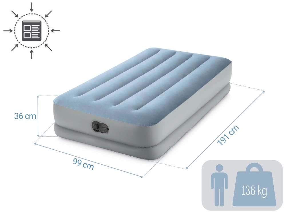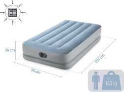 Практично и удобно надуваемо легло за един възрастен с размери 191 × 99 × 36 cm. Благодарение на технологиите Fiber-Tech и Dura-Beam предлага стабилна опора, мек велурен повърхностен слой и дълъг живот. Вградената USB електрическа помпа осигурява бързо напомпване навсякъде – от пауърбанк, зарядно или USB порт. Максимално натоварване 136 kg, в комплекта има чанта за пренасяне и ремонтна лепенка.