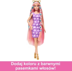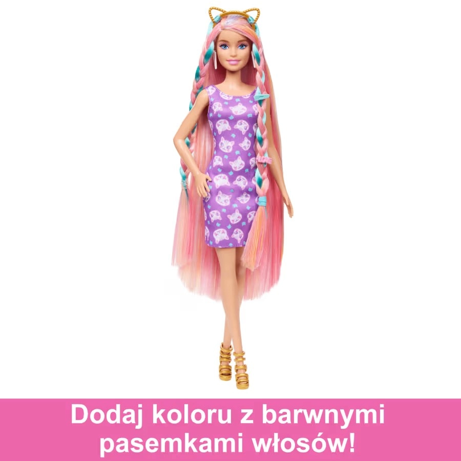 Открийте света на стила с куклата BARBIE Игра с косата. Благодарение на много дългата руса коса с цветни кичури и богатия комплект аксесоари, децата могат да правят прически – от сладки кокчета до оригинални плитки. Стайлингът лесно се допълва от блестяща мини рокля, сменяеми обувки на висок ток и чанта.